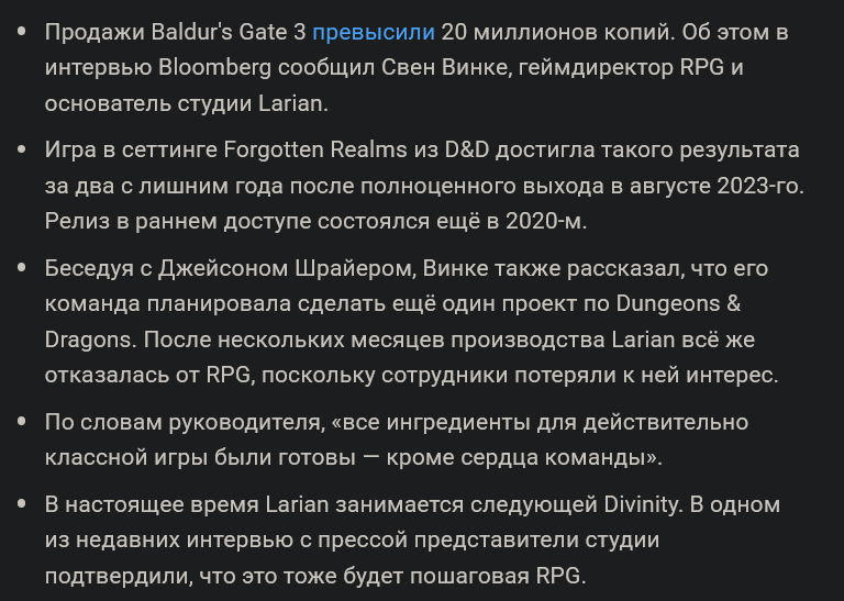 >>50555190 (OP) > Тем временем Baldur's Gate 3 выиграла в номинации Best Community Support на The Game Awards. Игра забирает эту награду третий (!) год подряд. А в чем конкретно выражается этот камунити саппорт? Треды на дваче?