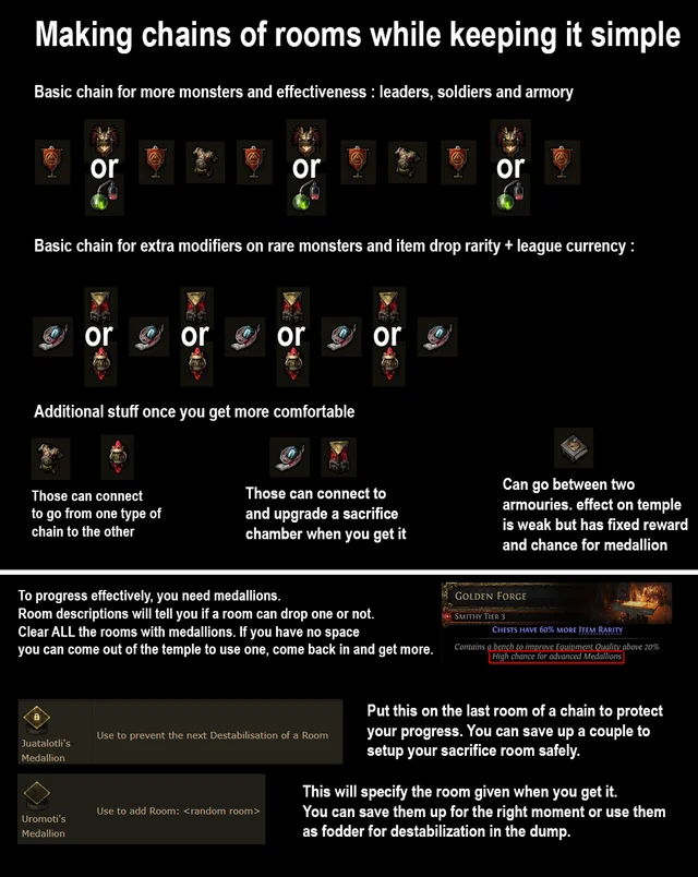 We are approximately doubling the values on existing modifiers applied to the temple at all room tiers. The Spymaster, Golem Works and Thaumaturge rooms apply bonuses to other specific room types in the temple. The Corruption Chamber room at Tier III now also adds a Corrupted Abomination to the Temple. The Spymaster room at Tier III now also adds an Unchained Beast to Temple. The Golem Works room at Tier III now also adds a Royal Sentinel to the Temple. The Generator room at Tier III now also adds a Royal Colossus to the Temple. The Sacrificial Chamber room at Tier III now also adds a High Priest to the Temple. The Thaumaturge room at Tier III now also adds a Quadrilla Sergeant to the Temple. The Alchemy Lab room at Tier III now also increases Gold Found. The Treasure Vault room now also adds 25% Rarity of Items dropped to the Temple.