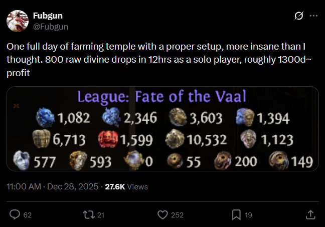 Как хорошо, что я не абузил храм, как сосал, так и сосал хуй на мапах с нулевым лутом. 10 дивов накопил за неделю и 10 вкинул в билд, пока храм абузили на 50 дивов в час. Очень нравится мапесы бегать очень вкусно мням-мням, ещё лаги по 1000 пинга нравятся очень. Обожаю ГГГ и Джонатана