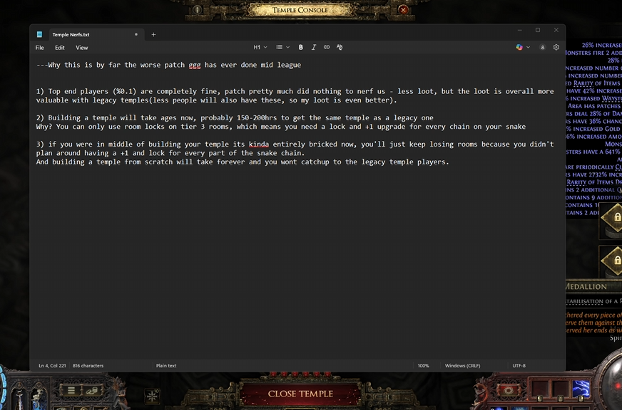 Halving the number of rooms that are removed when defeating the Architect. Allowing Reward rooms placed from the Architect’s Console to connect to any other adjacent room, not just paths, making them easier to claim. Allowing the Architect to connect to any other adjacent room The Tablet Research Vault room crafting outcomes can no longer destroy Tablets. The Uniques Vault room now excludes more common uniques as the level of the Temple increases. The Extraction Chamber is now significantly rarer, and you cannot get offered more than one of these at the Console Table.