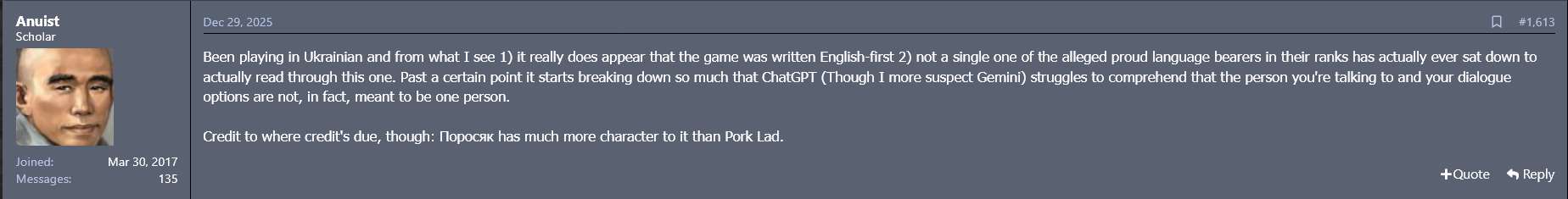 То есть Обдристанцы молодцы, все, что они делали за бракоделами из Биотварей и Беседки: КОТОР2, НВН2, 3:Кекас- получились намного лучше изначальных высеров, но оригинальность? Разве что огрызок Тирании и Альфача Протыкол.