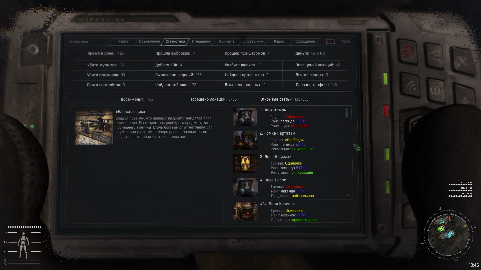 В Anomaly крафт просто мерзкий, даже с модами на подсказки. Постоянно надо чекать что тебе нужно, каждого ебучего нпц, каждую шмотку и пушку и чем дальше тем больше шмота тебе надо прочекать, не удивительно, что там количество мобов сократили в разы в сравнении со стасонкой, никто бы не крафтил, если бы там каждую секунду к тебе кто-то приставал. Но когда пошел монолит на барьере и радаре я просто не выдержал и перестал собирать чудо для крафта. Я просто обожаю крафт в играх, но ЭТО просто мегадушно, я в модах на факторио так не душился как тут. При этом сам крафт не сложный, собери несколько хуевин и получи другую хуевину. Хуй знает каким надо быть долбиком, чтобы в гамму играть. Тем более мне не понятно, почему она популярна у нормикала, который вообще не любит напрягаться.