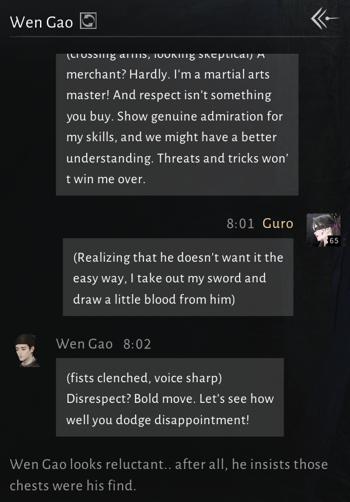 >>50579845 Ко мне вчера залетел хантер, а я тюрячке прятался как ссыкло, т.к. там нельзя атаковать. Он попытался меня атаковать, я услышал как он вынимает оружие и уже хотел нажать на логаут, т.к. подумал что пизда мне, но нет, он так и не смог вынуть свой клинок. Я уже хотел улюлюкать как шакал в злорадстве, но он подошёл ко мне и сделал поклон. Я охуел немного и почему-то тоже сделал поклон. Он вышел, я за ним. Выйдя за забор тюряги, где можно атаковать, он не напал на меня а ждал минуту пока не достану свой меч. Я со слезами на глазах атаковал первым. Он не юзал ничего кроме одного меча. Я дал ему бой и добровольно решил отсидеть срок.