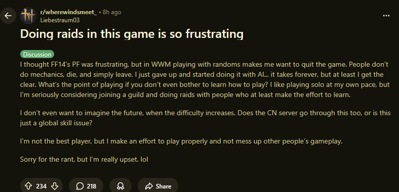 Искренне удивлён какой уровень скилла именно в этом треде. В других тредах типы заряженные, даже раб отники и скуфы под 30, а тут прям сборище казуальных терпил с автопарированием, даже посраться по поводу механик не с кем. Из-за этого у меня оверзавышенные ожидания были, жаль что так как есть в итоге.