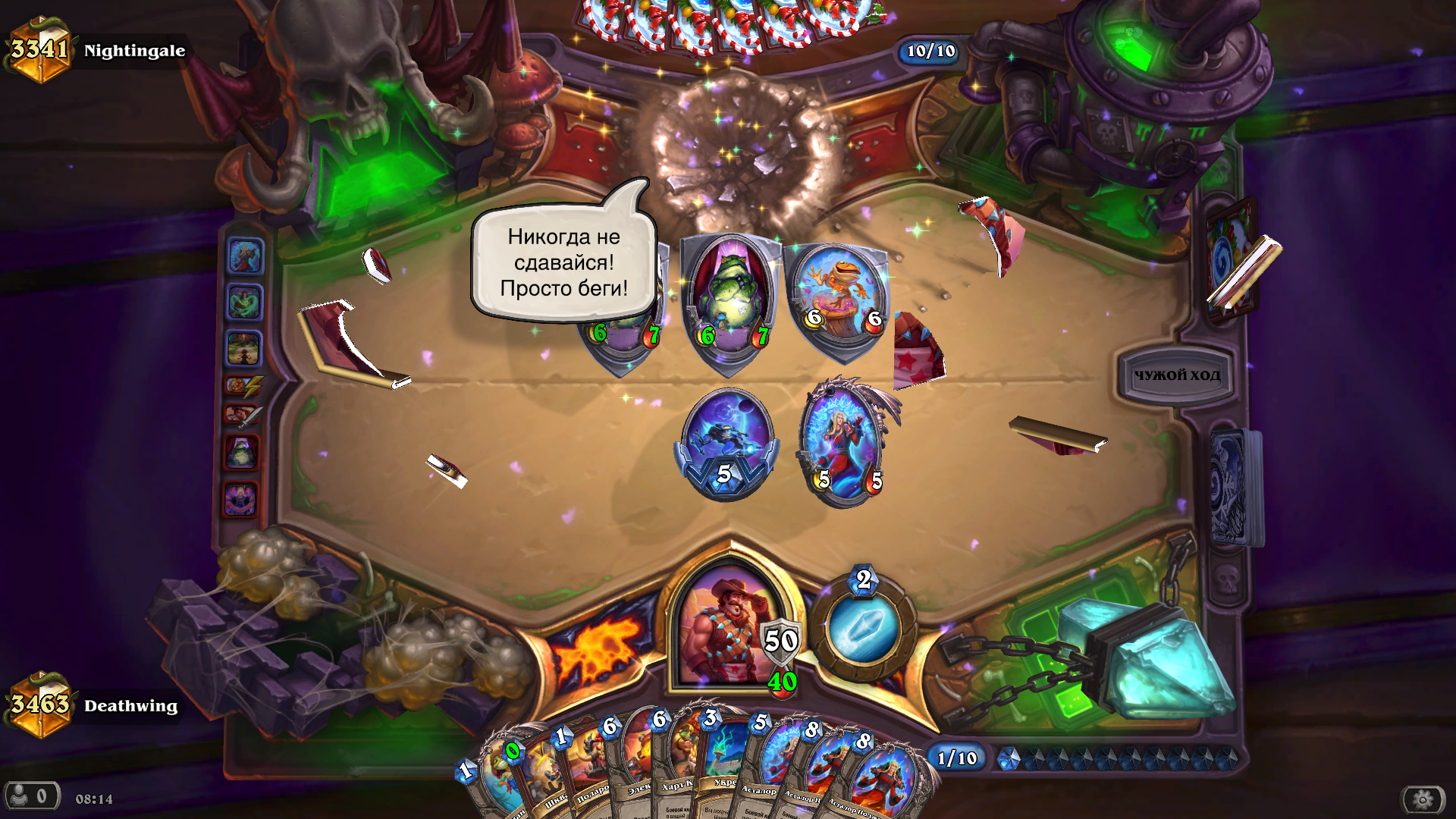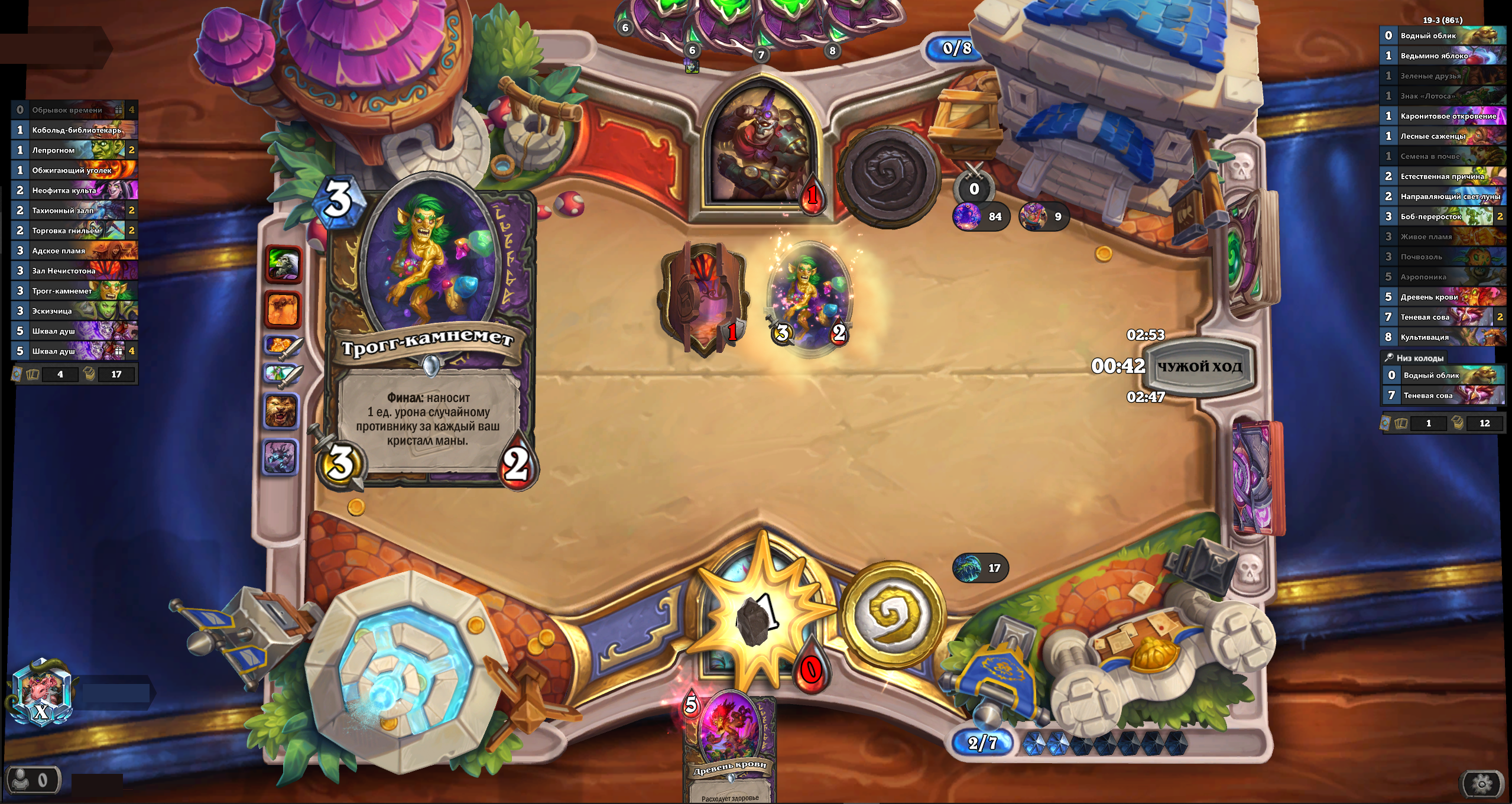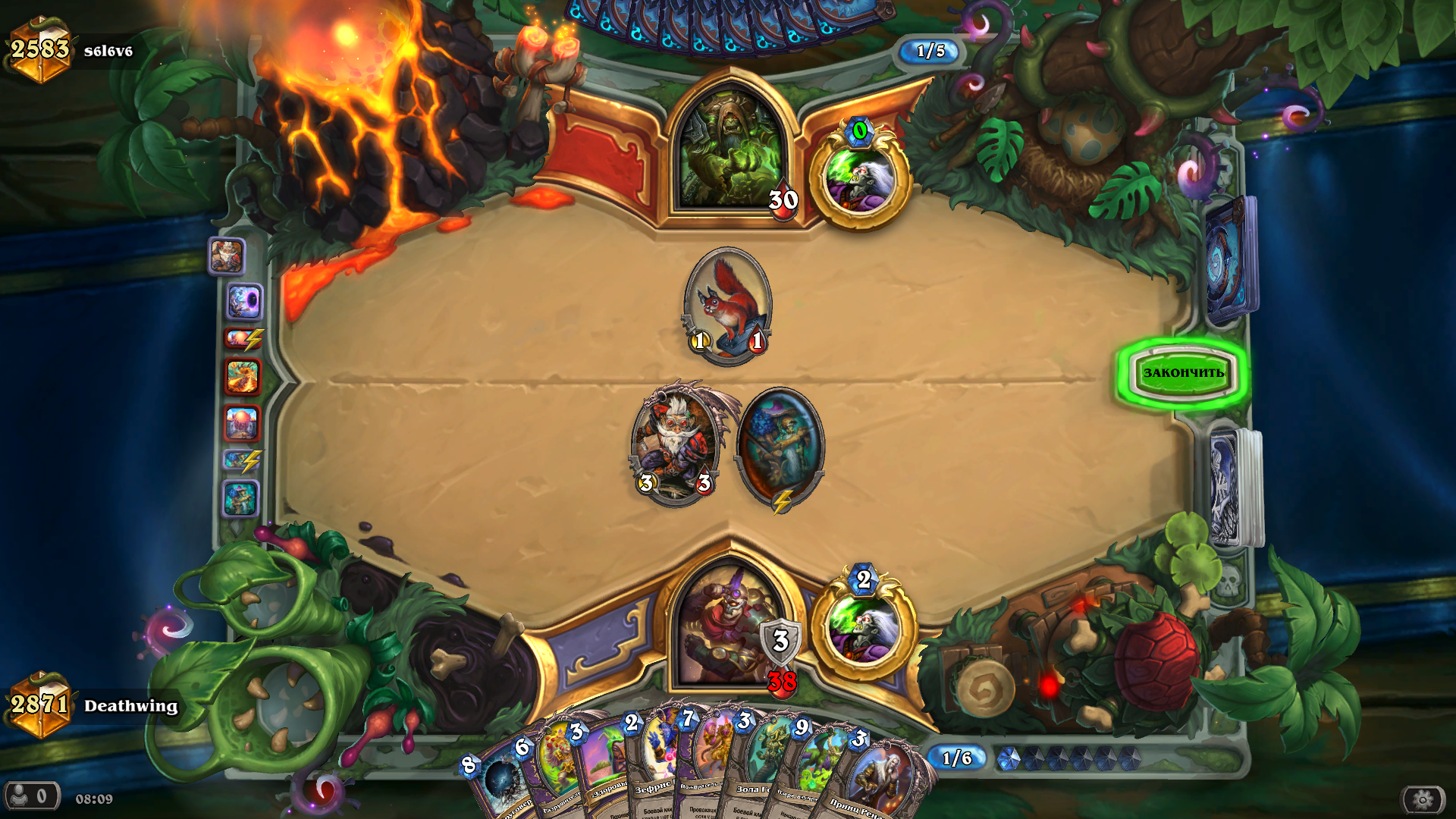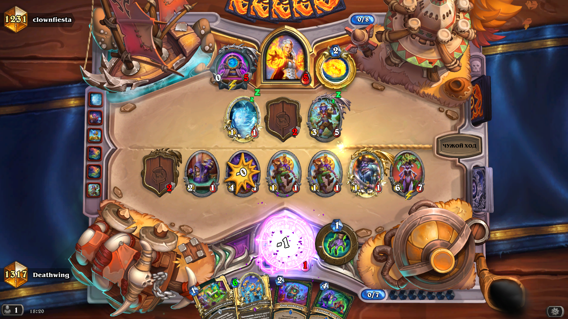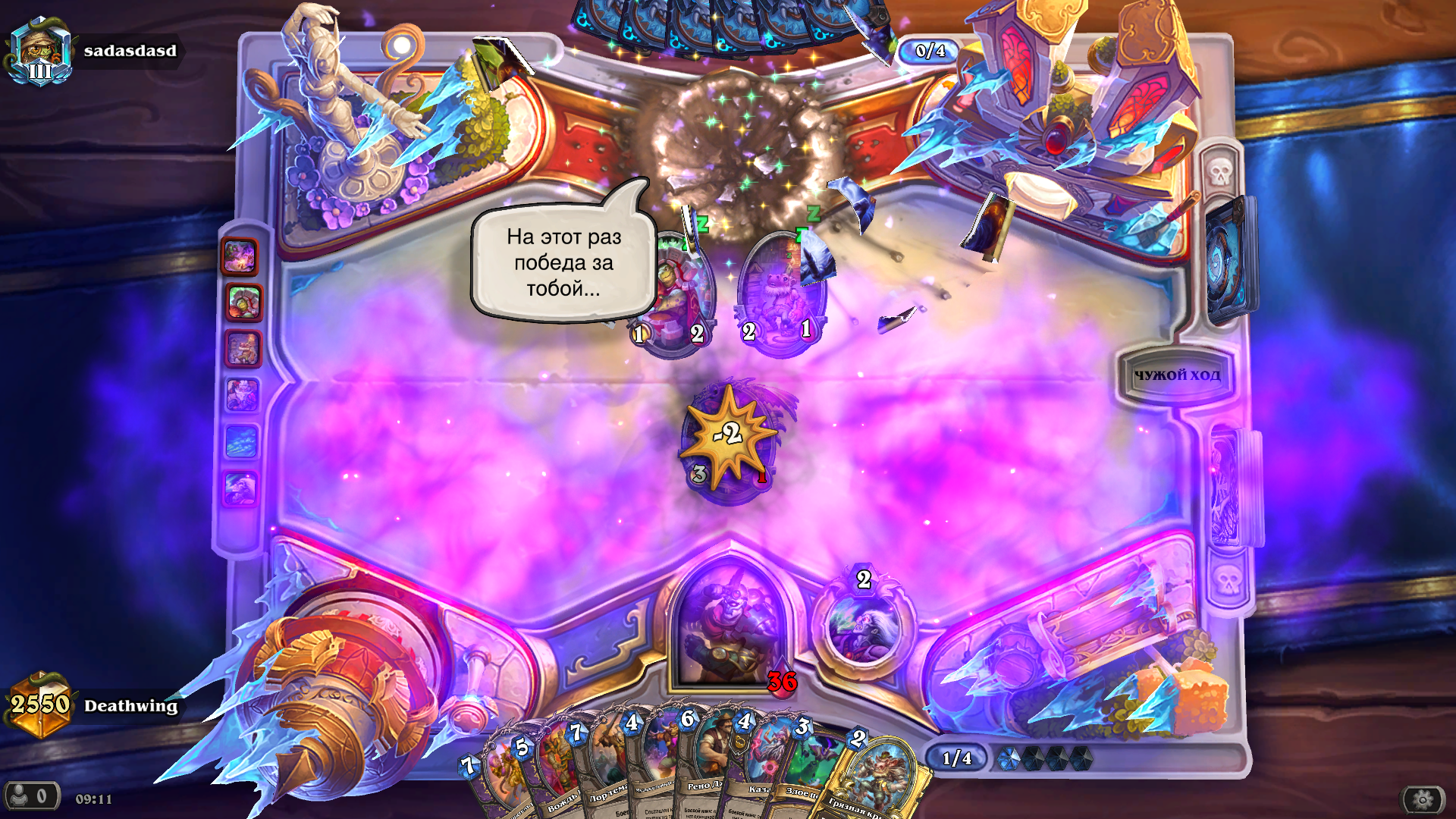 сегодня день благословленный подкруткой в мою пользу, тупо не проигрываю, даже когда играю на несуществующей колоде элементаль-шамана собственной сборки, все равно как-то вовремя приходят нужные карты для летала, оппоненту не хватает ответов, чтоб отбиться и отхилиться, просто чудеса