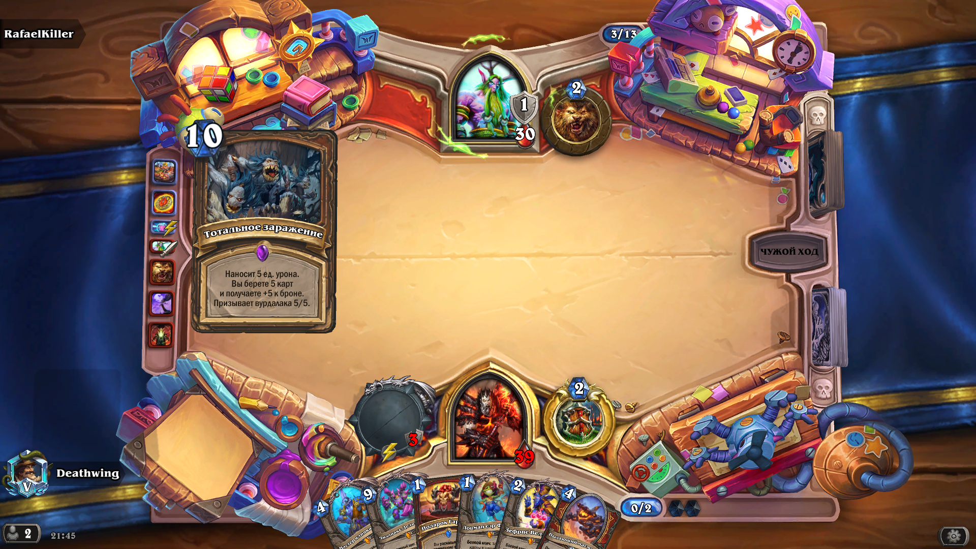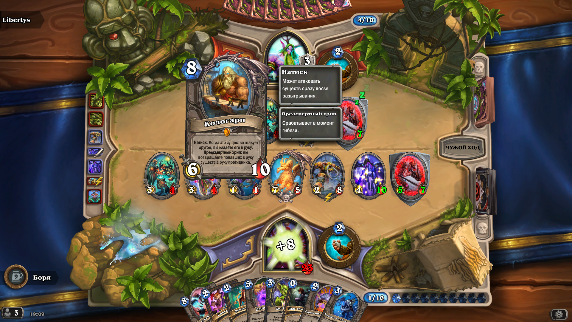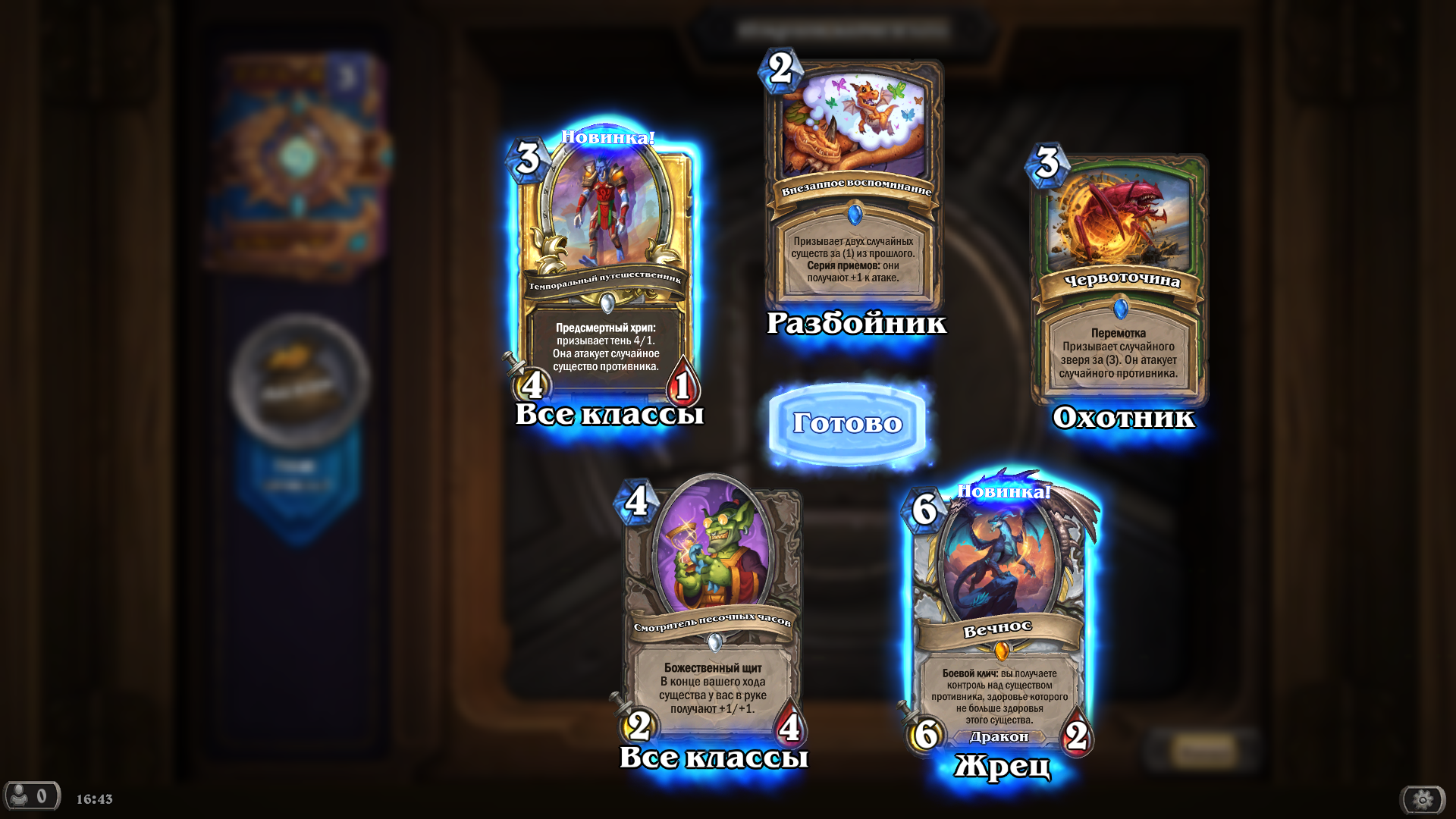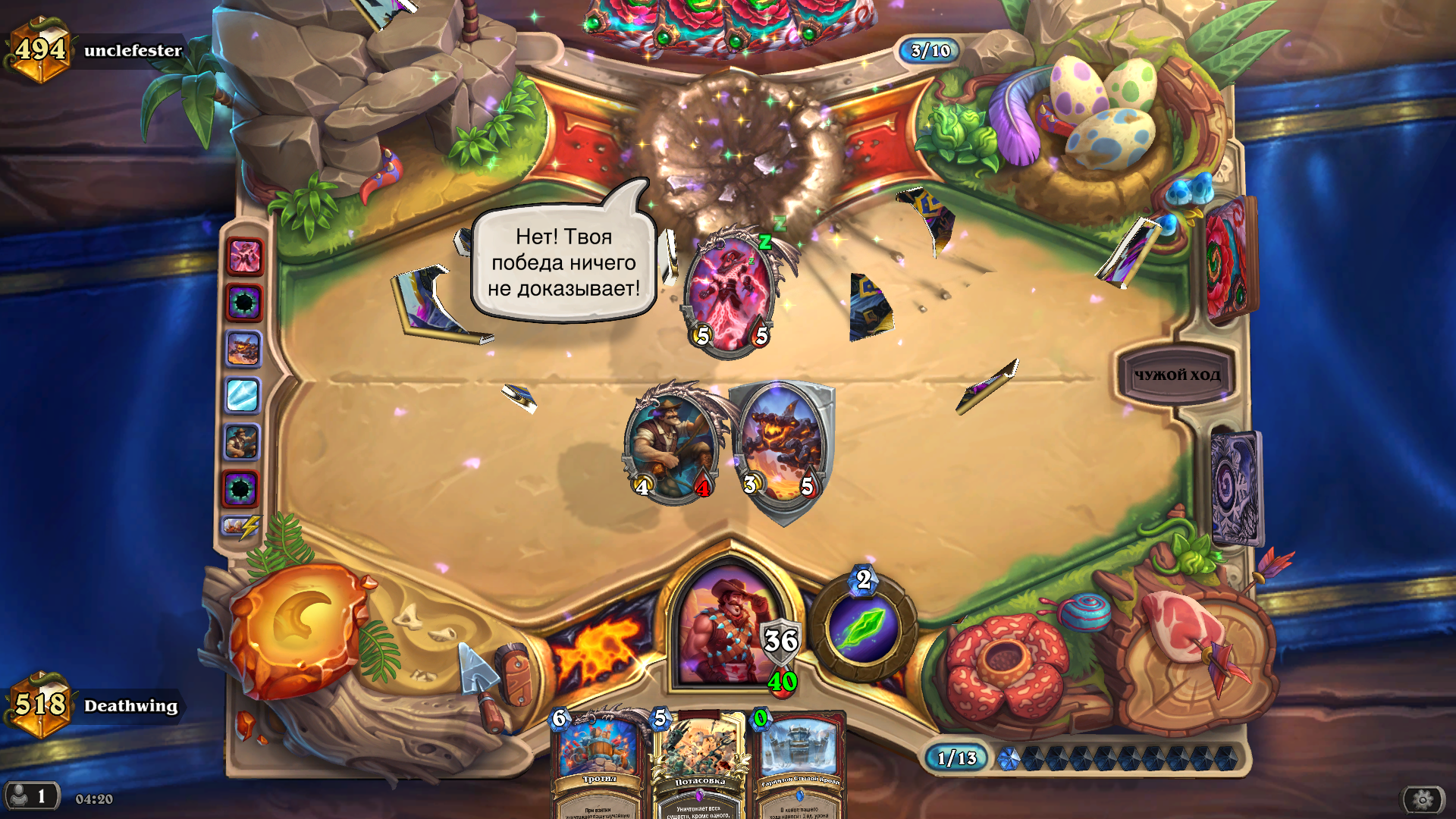 сегодня проклятие с аккаунта сняли, сыграл шесть игр, победил во всех, скилл появился, походу, вчера не было, а теперь вот он, научился побеждать, смешно одна игра, кстати, очень хуево начиналась, играю миррор, у чела вся ранняя игра как по заказу, у меня в руке кал, ни одной карты дешевле 4 маны, сижу обтекаю, только на четвертом ходу смог поставить дракошу 6\9, так дебич вместо того, чтоб своей созданной доской меня добивать, решил нахуй потрейдиться в него тупа всем столом и обнулил своё раннее преимущество, а потом у него карты кончились, а я начал своими дорогими его щемить и победил вот такие дела пик из другой игры, это просто душение ханта, у которого никаких ответов ни на что не было, огреб со старта