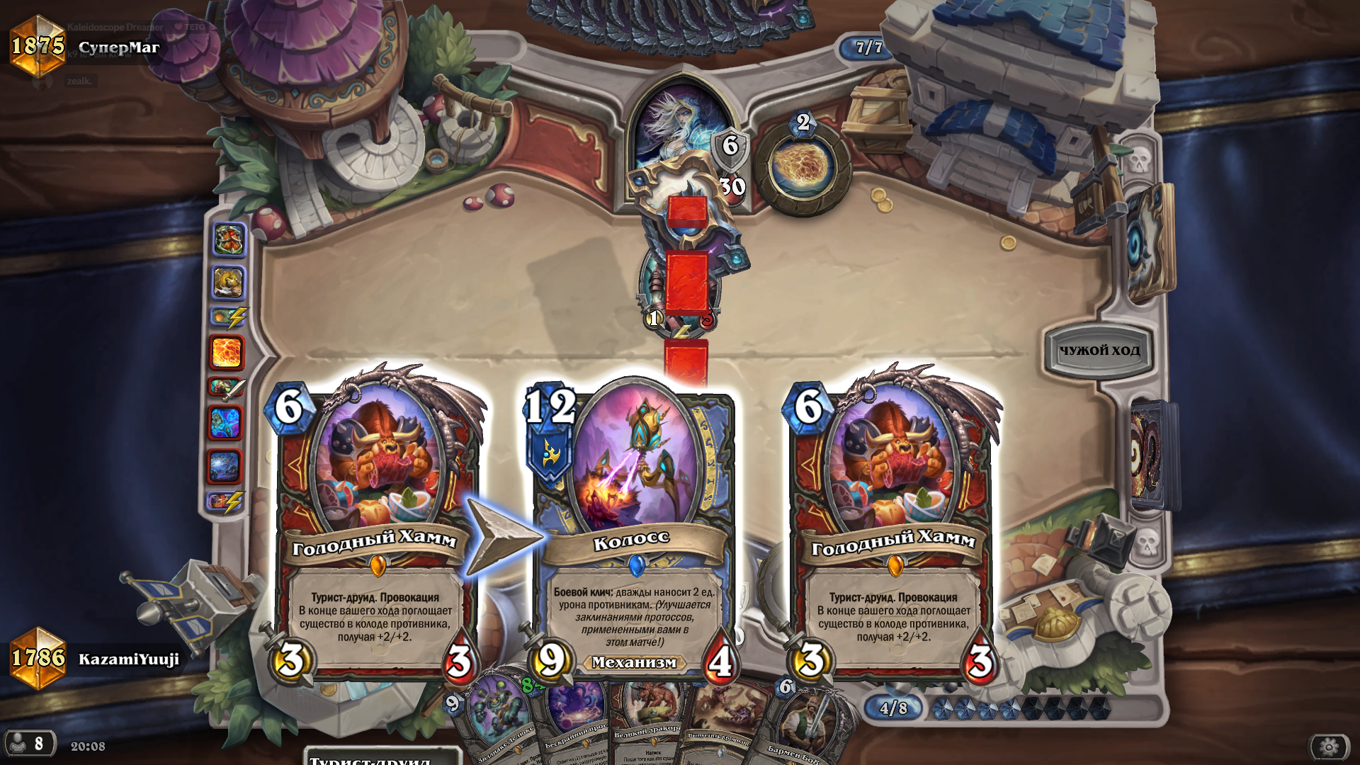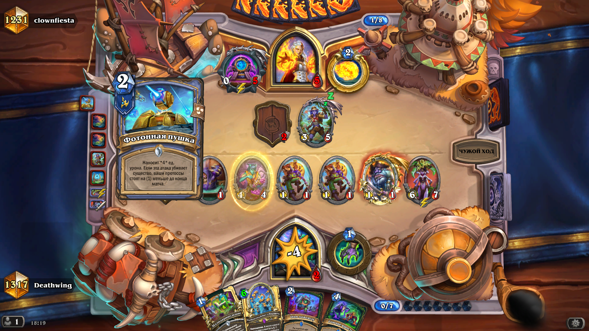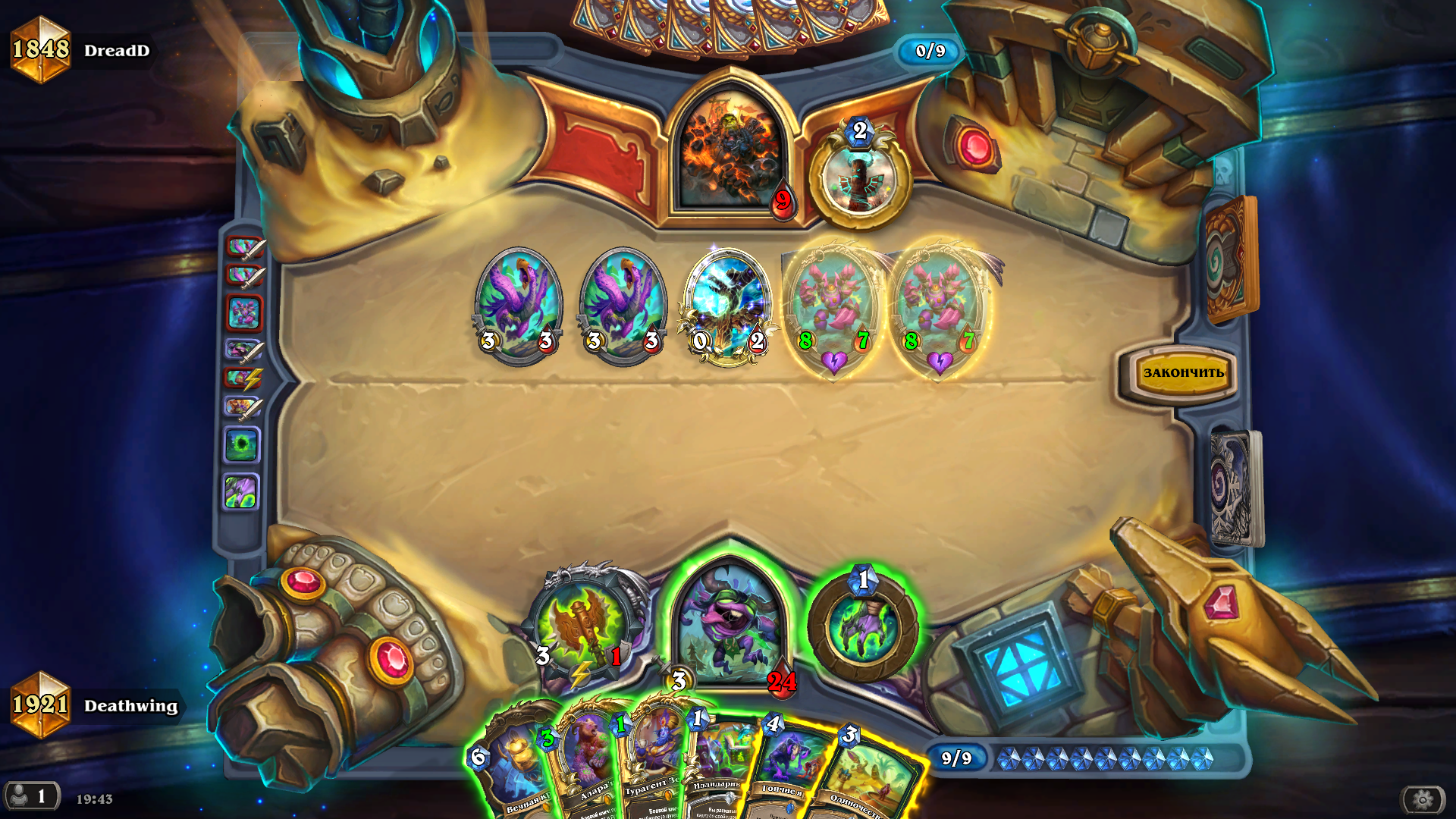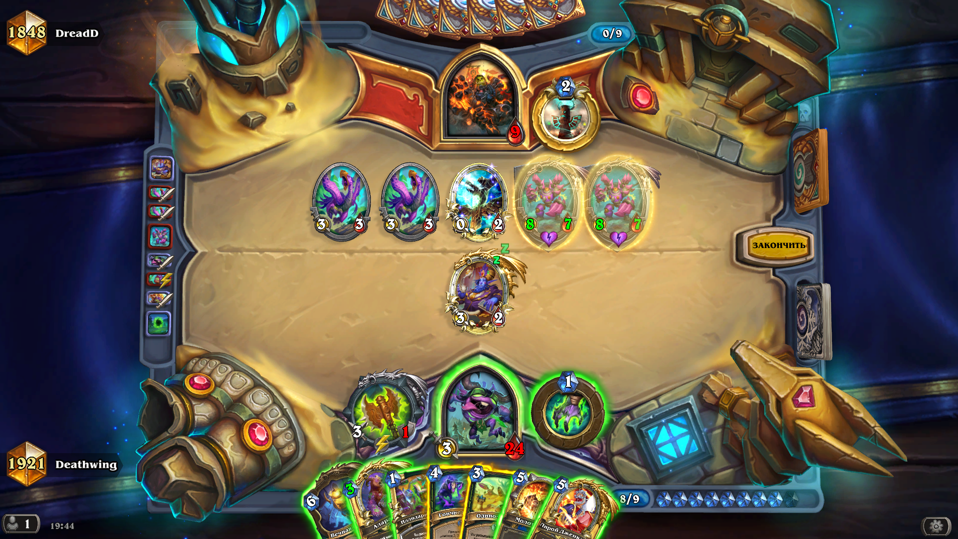 сегодня проклятие с аккаунта сняли, сыграл шесть игр, победил во всех, скилл появился, походу, вчера не было, а теперь вот он, научился побеждать, смешно одна игра, кстати, очень хуево начиналась, играю миррор, у чела вся ранняя игра как по заказу, у меня в руке кал, ни одной карты дешевле 4 маны, сижу обтекаю, только на четвертом ходу смог поставить дракошу 6\9, так дебич вместо того, чтоб своей созданной доской меня добивать, решил нахуй потрейдиться в него тупа всем столом и обнулил своё раннее преимущество, а потом у него карты кончились, а я начал своими дорогими его щемить и победил вот такие дела пик из другой игры, это просто душение ханта, у которого никаких ответов ни на что не было, огреб со старта
