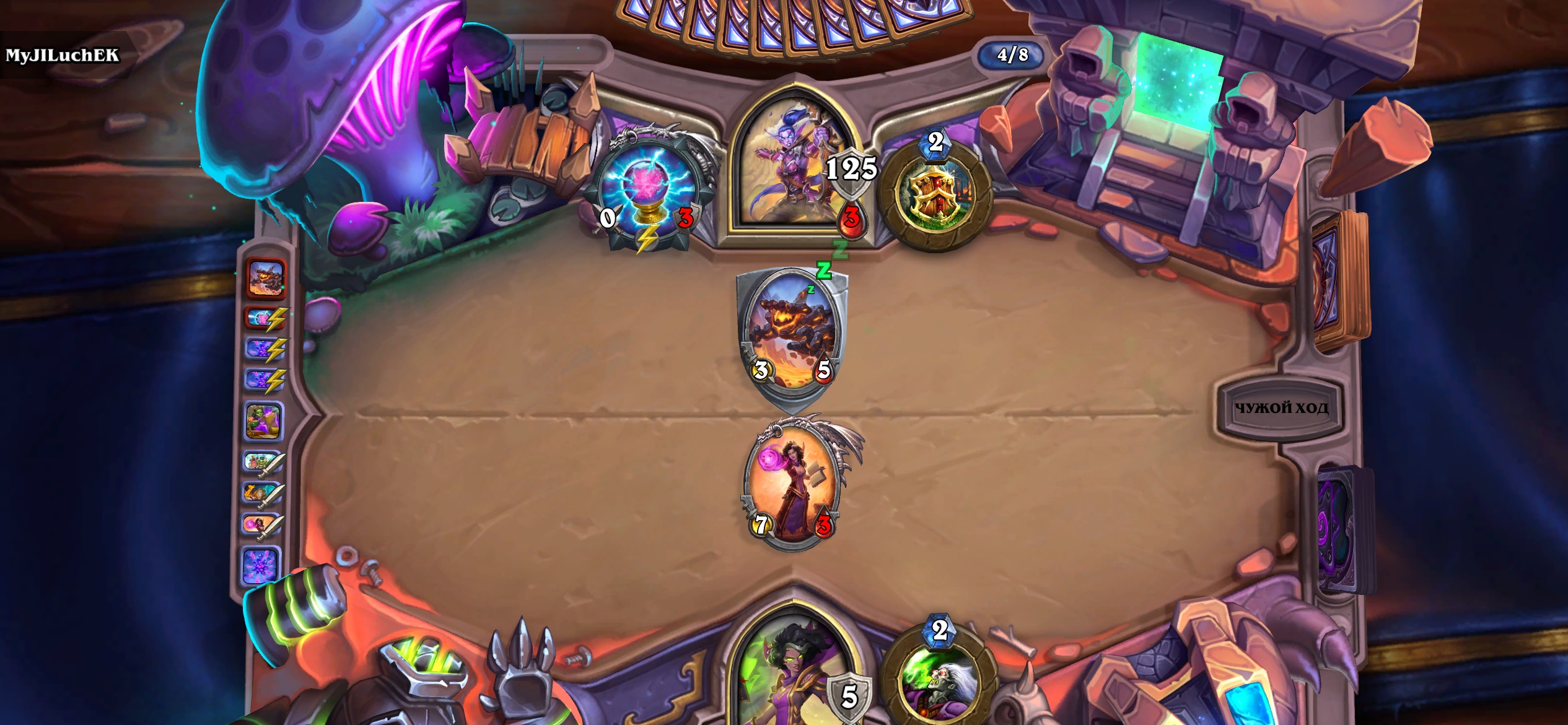 Всегда есть баф абилки, постоянно по 5-6-7 урона с абилки и засёр стола единичками, лёгкая возможность зачистить весь твой стол, бессмертие, чтоб получить себе лишний ход. Ну и вишенка на торте - комба, где в тебя может влететь до 100 урона. Так как бафанная абилка, карта на срабатывание силы героя дважды и применение силы героя ко всем противникам. Даже если у тебя 2 существа стоят, плюс ты третий - 3 противника, абилка на 8, 48 урона лови родной.