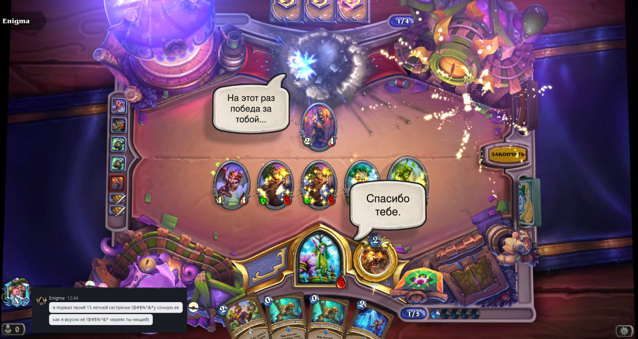 >>50582581 (OP) Решил скачать этот ваш харстоун, у меня дека была ттк маг на великанах, одних она так и нахлобучивает как раньше на 6-7 ход, но столько кансера добавили в хс за годы моего отсутствия - это пиздец. Какие-то нахуй 20 макс маны, каждый первый играет с 40 хп и 40 картами в деке, каждый второй играет на маге с квестом на раскопки, как будто мета в вайлде состоит из этого и каких-то комбо вомбо. Причём видно, что аутисты даже деку не смотрели, просто Ctrl C Ctrl V код, играют жопой. У чела на столе уже летал мне в ебало - он разменивается с моим столом и скипает ход, я ему сношу моментально лицо великосами своими. Причём хавают даже самые очевидные наёбки типа секрета, который даёт в руку две копии убитого существа и на столе один блядь великан тут же появляется.