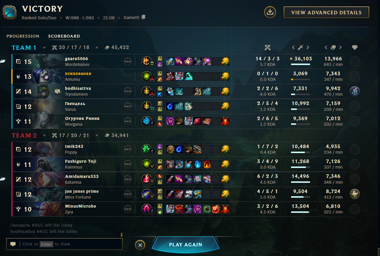 >>50681035 чёто в этом сезоне тоже ливеров больше стало по очучениям. только за сегодня сыграл 2 игры и в обеих были ливеры. сначала в моей команде ари накуканила 3 раза бренда до 10й минуты, отчего у него треснула менталка и он ливнул. потом в следующей игре у чогата, стоявшего против кайлы, произошёл ментал мелтдаун от нескольких ганков мидера+кайлы. со счетом 0-6-1 ливнул на 15-й.