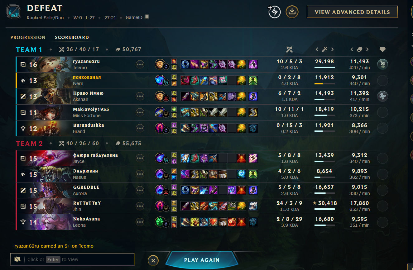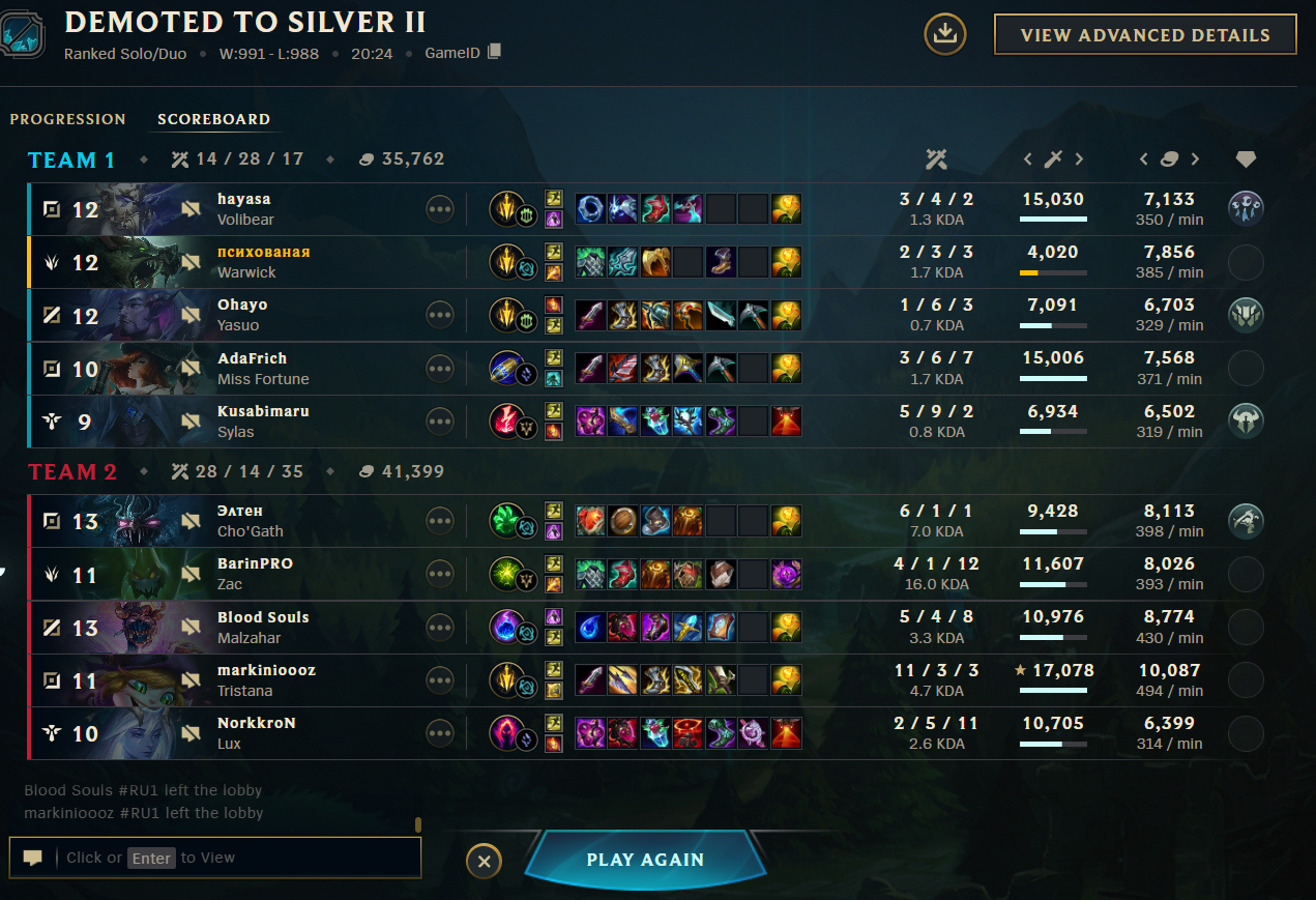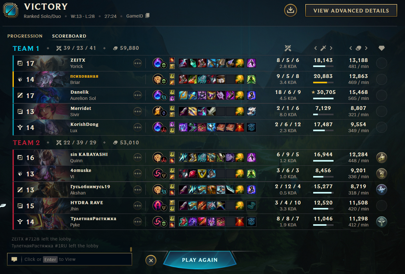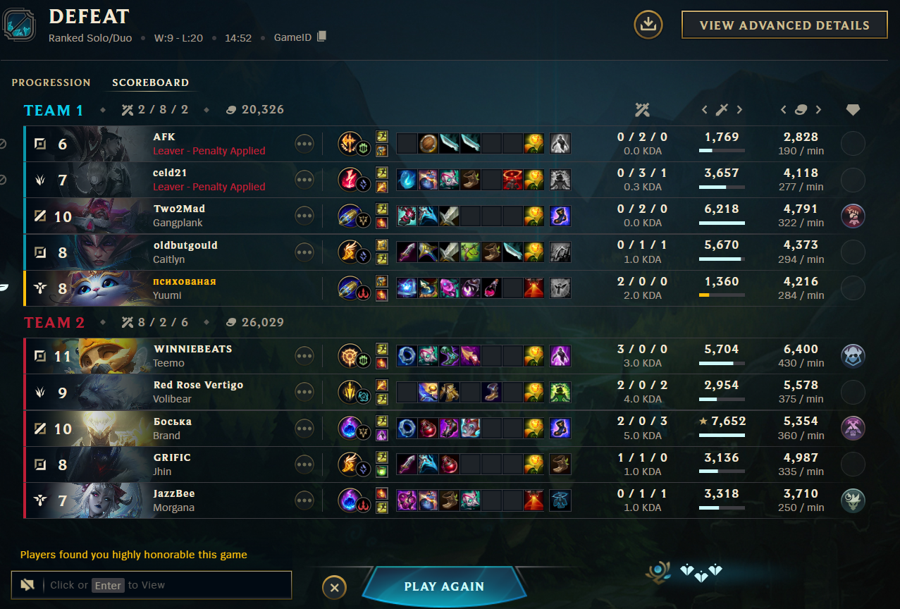 У меня когда такие игры случаются, я прямо чувствую что с какой-то минуты это будет луз. Тиммейты просто перестают играть. Они не фидят, просто не знают что делать дальше. Будто рубильник им ритосы выключают.
