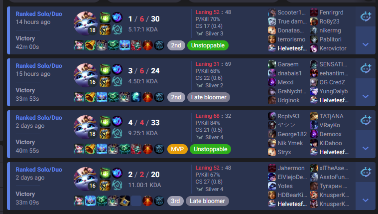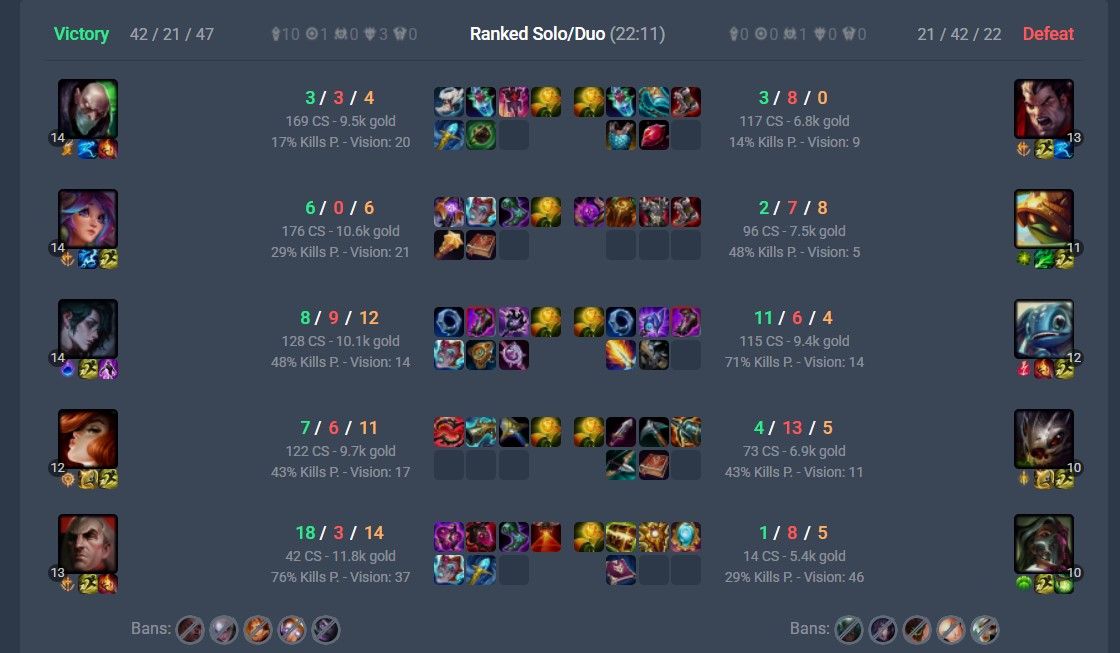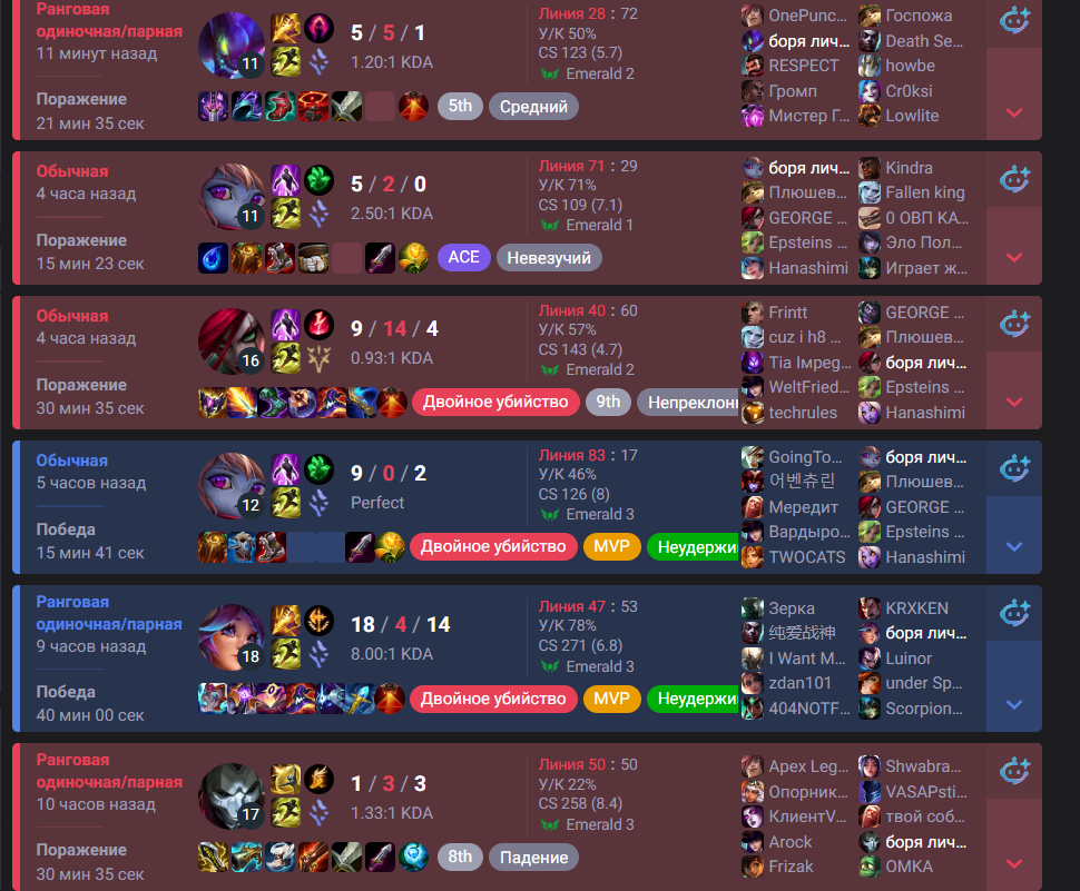А если ты имел ввиду что типа каждый может сыграть 0-14 то нет, у меня такого не бывает, даже если я умру 14 раз то у меня килов будет минимум в полтора раза больше, уже не говоря о ассистах. Я никогда так не сыграю и никогда не выходил с лайна с 0/7/0 я же не тролль и я играю на победу. Да бывает что меня ебут на лайне если я играю не на своей роли и например иду в топ, но уже после 2ой смерти я включаю сейфгейм и дальше своей вышки вообще не выхожу. Подкармливаюсь с крипов, ловлю на ошибках и помогаю джанглеру забирать воидов. Но я перестаю умирать, я понимаю что моей команде будет гораздо тяжелее если я продолжу умирать.