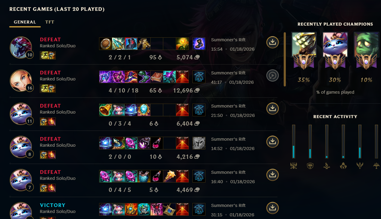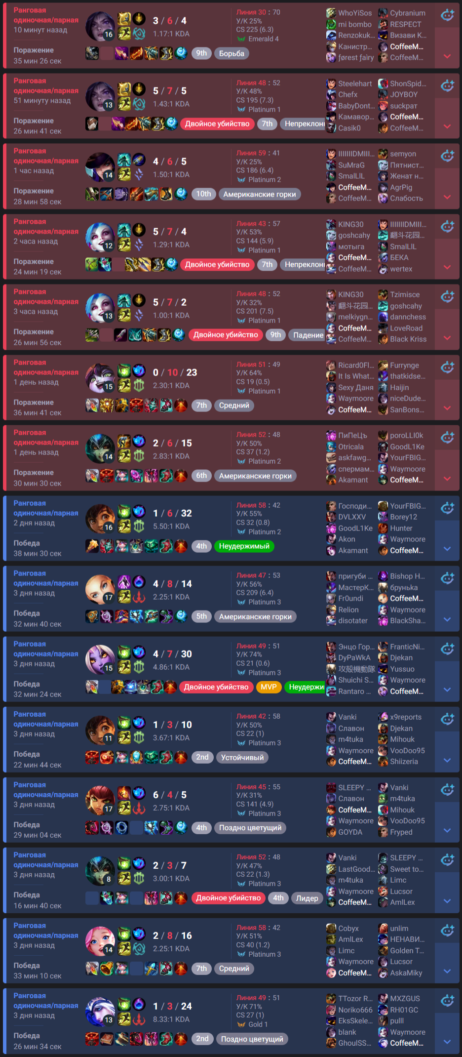 >>50689257 Я играю с... 2023, вроде. Как я уже говорил я 1к+ игр провёл в обычке вообще не понимая что происходит, и только в конце прошлого года начал задумываться что я делаю не так. Ну и игры обычно проходят как пикрил, ясика я ебал на лайне, потом уже всё. Топ проебал, бот проебал, 1в9 я играть пока что не научился...