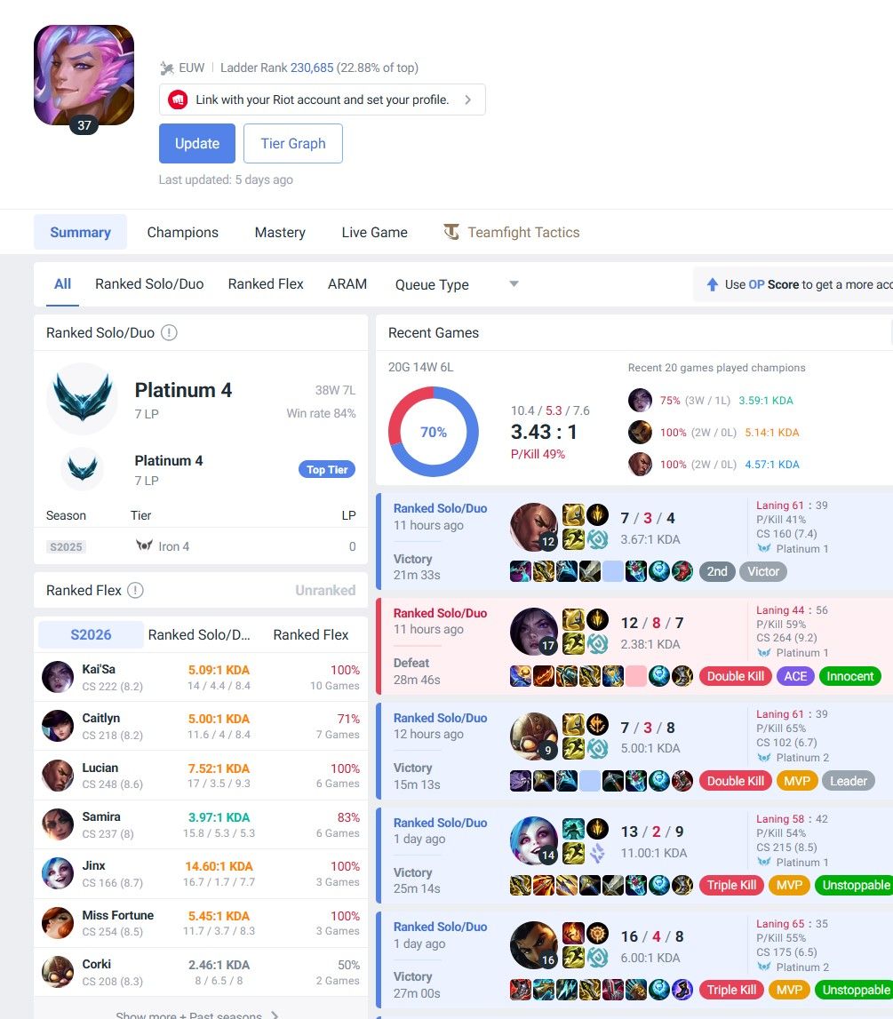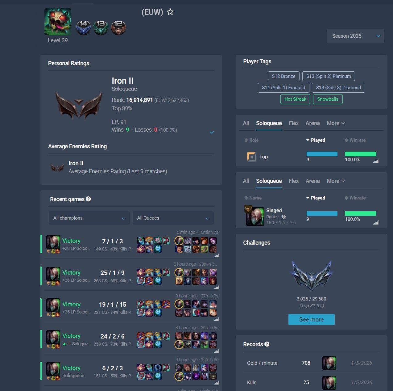 невероятный гений по мнению матчмейкинга рито, на нулевом акке с уёбищными нормалами он за одну наикрутейшую катку залетел сразу в платину на калибровке где мгновенно отсосал и ходил афк танцевал и фидил на один лайн
