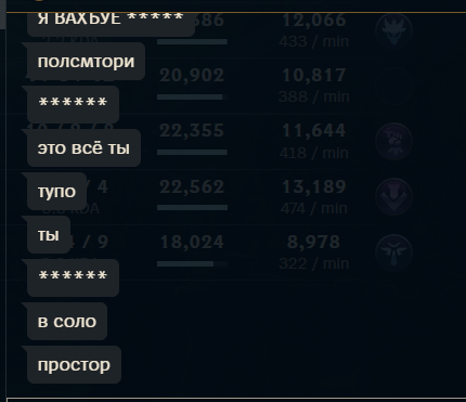 интересное начало дня и самое прикольное что все претензии ботлейна именно ко мне, что я где то недоиграл, не затащил, не выиграл им каточку, а не к тому что нам мид и топ тавера на 10й сносят после позорного отлета двух уебков и я вынужден встать дефать хотя бы мид вышку до респавна и из за этого челы 2в3 на боте подрались и сфидили, по моей вине и в таком ключе все претензии ко мне всю игру были за 25 минут снесли