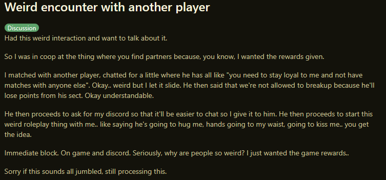 >>50589812 Нууу на мой взгляд в WWM действительно есть проблема с рандомами у которых половина мозга отсутствует это да. Возможно это связано с тем, что игра позиционирует себя как всё же соло прохождение. Рандомчики там сотку часов провели в своем соло загоне, а тут решили в онлайн пойти и начинаются проблемы.