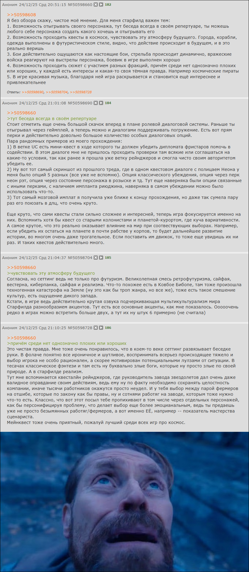 >>50598728 Блин, очень здорово всё расписано и объяснено, и этим постом и двумя выше. Я, признаюсь, в старфилд не играл, только сидел лулзы с треда ловил, но перечисленные преимущества вызвали к игре интерес. Вряд ли в обозримом будущем дойдут руки до проекта, но буду подглядывать в его сторону. Вот так наслушаешься жёсткой ругани и критики, а игра на деле вполне достойная.