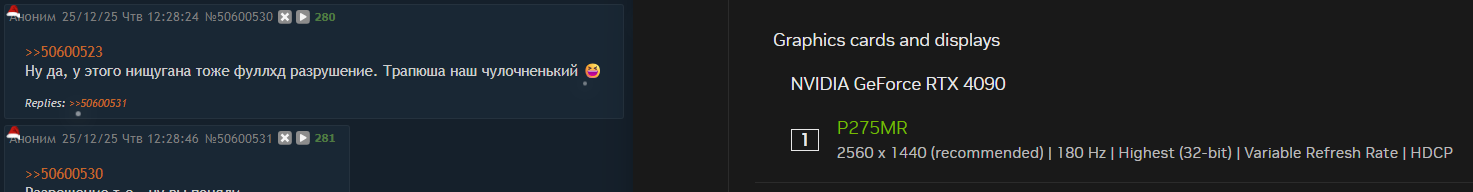 >>50600403 Так давай запись нам запуска NMM и следом игры. А нет, ни хуя, да? Или ты хочешь сказать, что обладателям i7 12-14gen/Ryzen 7 и 4090/5090 тоддик урезает графику? И 2-4к моники, ни хуя не 2-4к а фулл хд??? И все мы слепые? Тебя тут не эмоциями разъебали 2 треда читал, орал в голосину, а фактами. С тебя требовали раза наверно 5-6 предоставить NMM. И ты чел, который косит под тянку с тремя детьми ебать ты пиздабол. Либо у тебя дети овощи, либо у тебя их нет, либо они в детском доме. Ибо моя жена с 2мя детьми, в Сисм4 и Инзой за полгода поиграла всего то 2 раза. Так что я склоняюсь к тому, что ты пиздец какой пиздабол! не можешь предоставить адекватных пруфов!