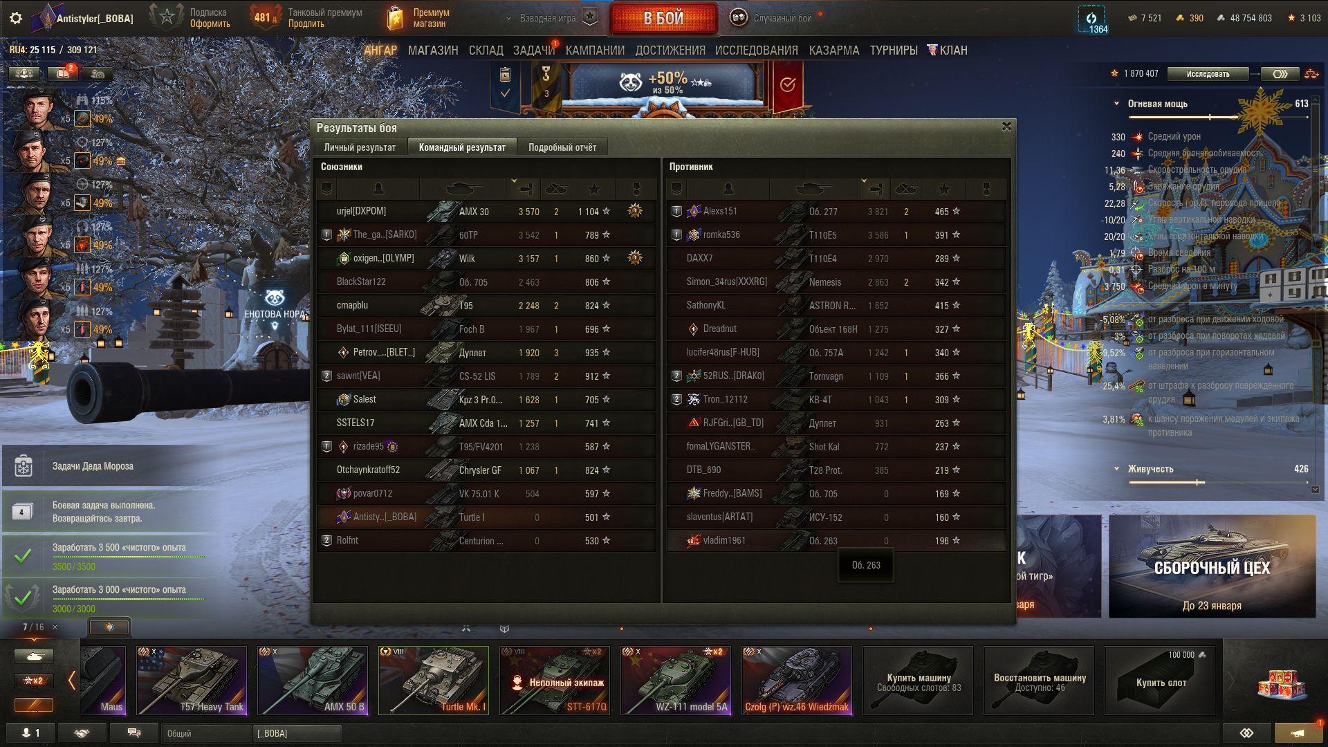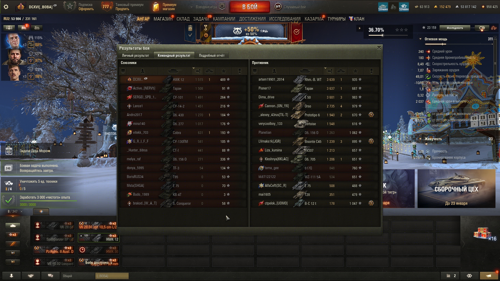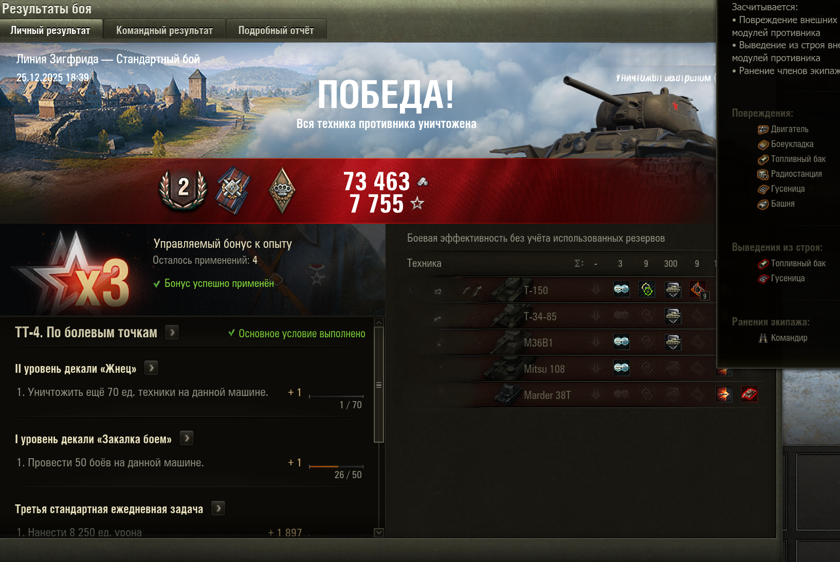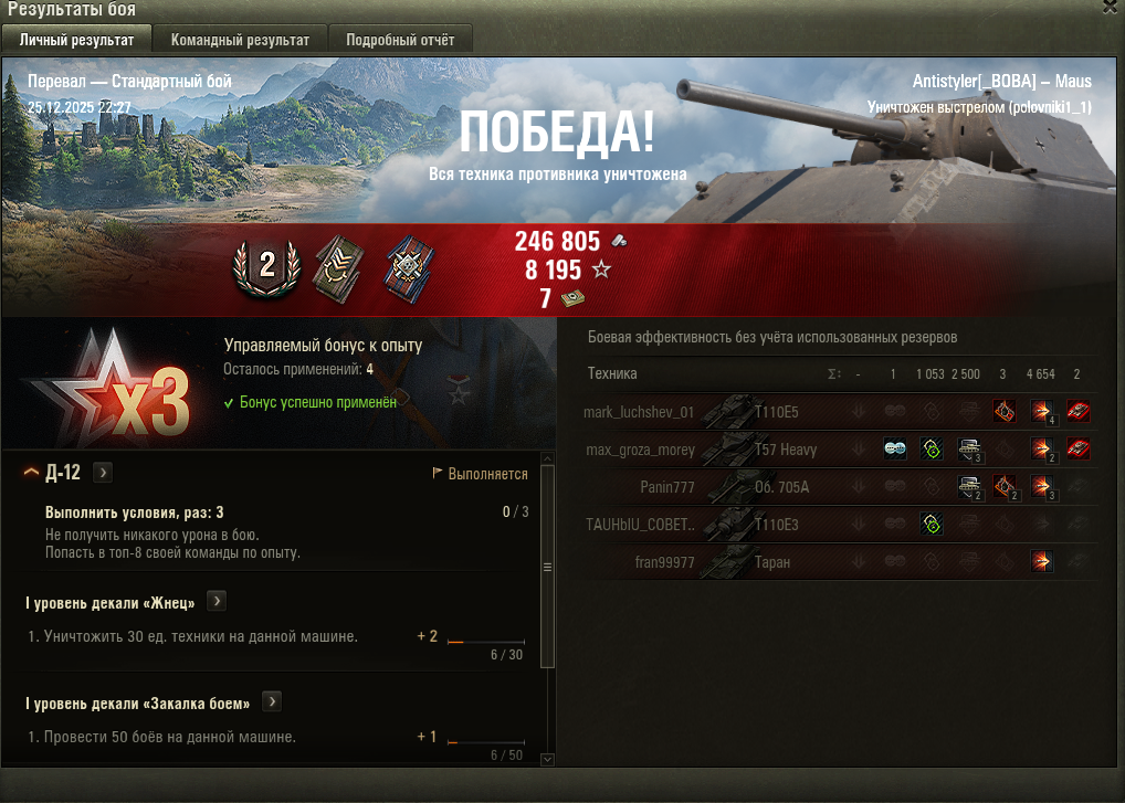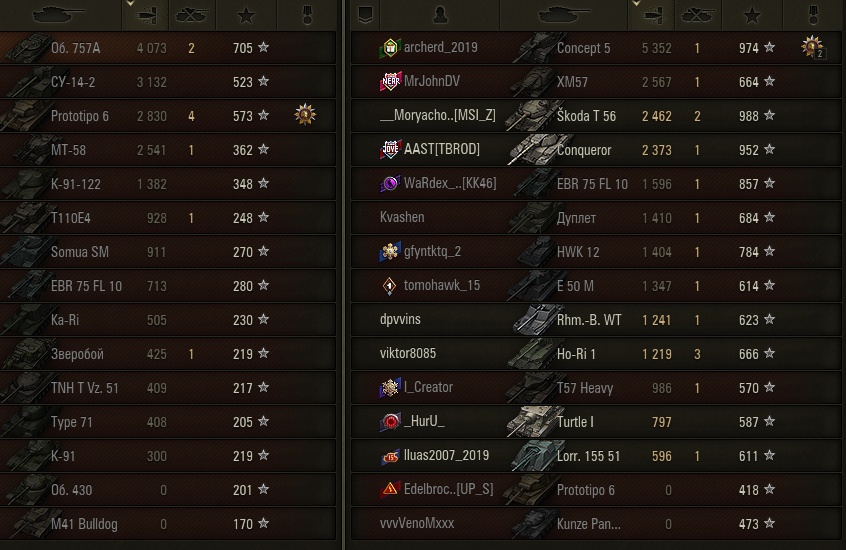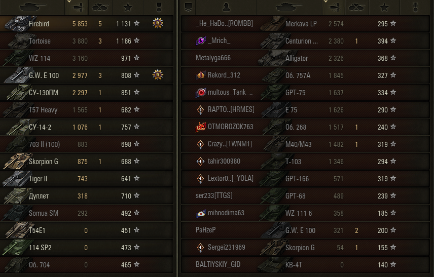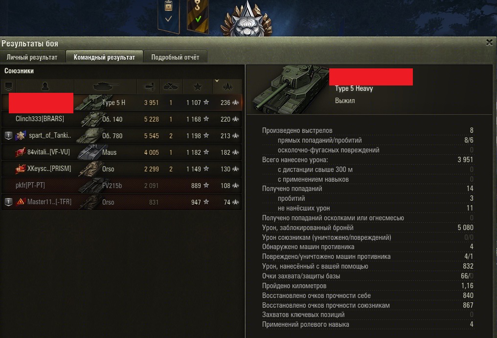>>50588660 → >>50591102 → >>50591076 → Спасибо анонам за советы в прошлом треде, пердячая тяга не подвела, влетел с трех стами хп в Штюгмауса с 800ми, но видимо кто-то успел вдамажить ему и прокнуло. Осталась задачка на криты, если есть мысли и желание ими делиться, отговаривать не буду. Условие: Основная задача — повредить или вывести из строя суммарно 6 внутренних модулей или членов экипажа, второстепенное задание — уничтожить 5 машин противника. Леха 6к ммр