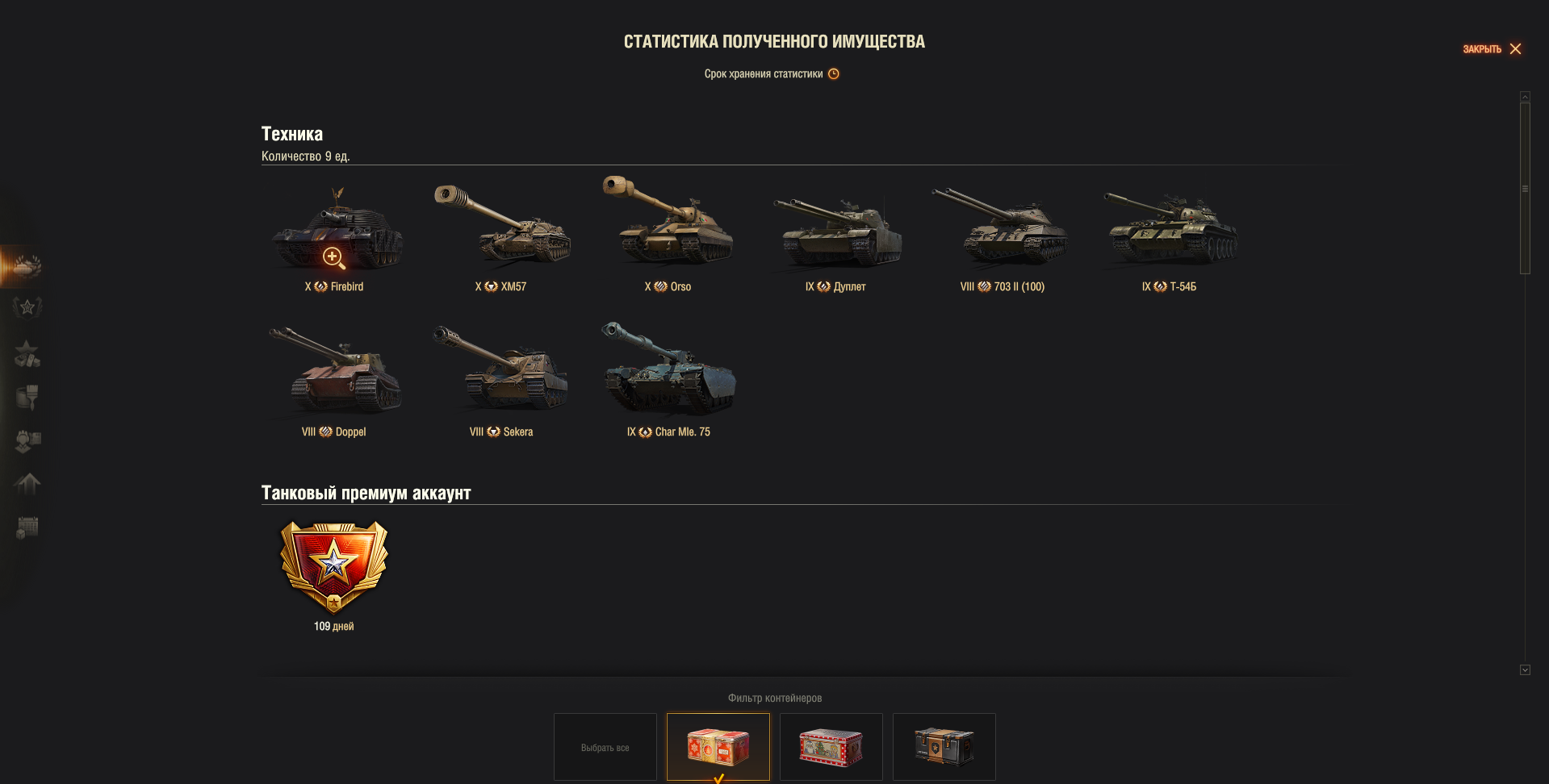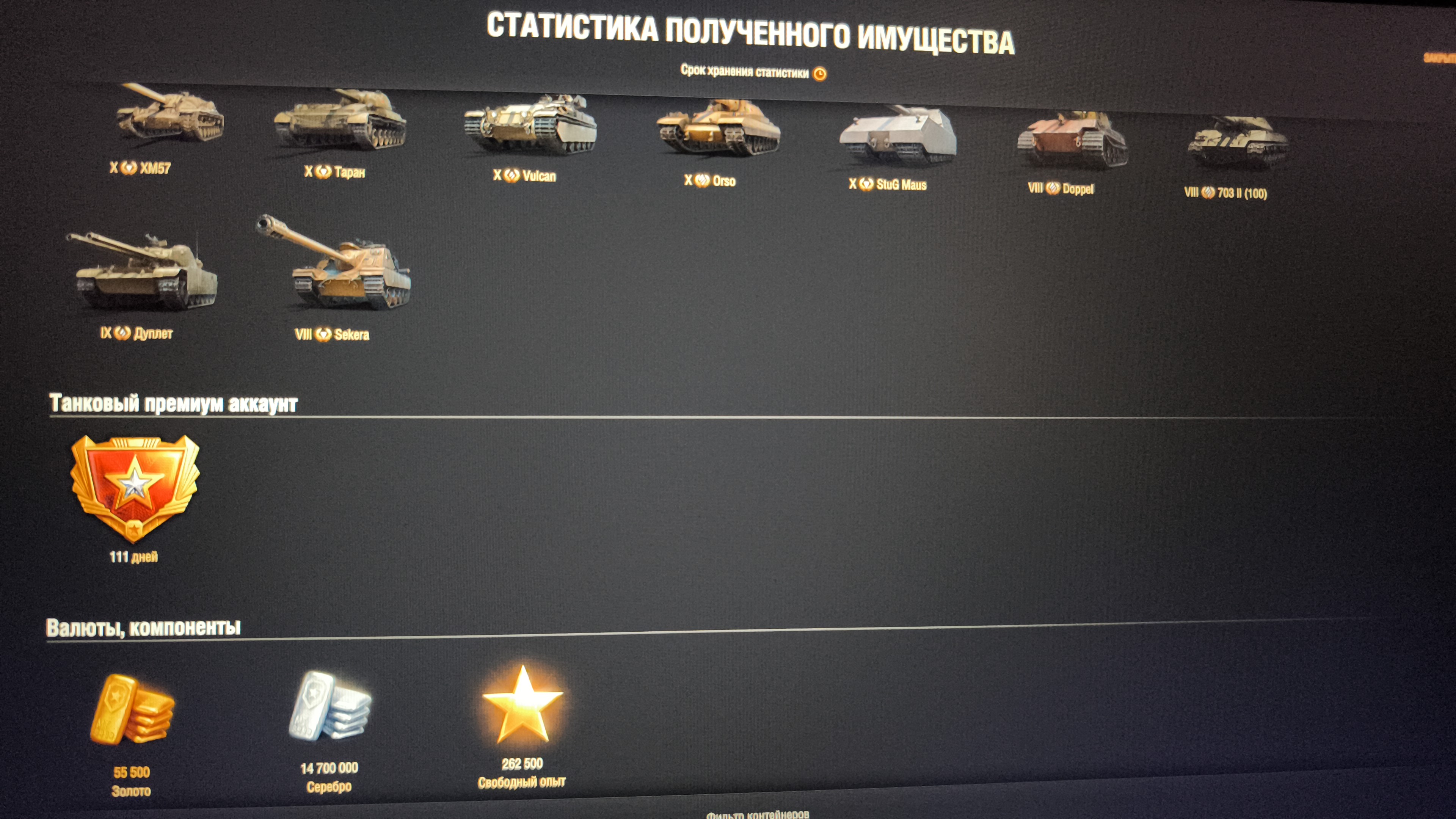 Пиздец, выпал, пацаны. Да КАК выпал. Было 45к голды сохранено под НГ, постепенно выкупал коробки по 5-10 штук, как давало за голд. Думал ну выпадет что нибудь, полутаю, уж что то на 45к голд должно допнуться... Фарт пошел сразу, с первых 10 коробок выпадает Доппель и Секера, по гаранту выпало буквально 2 танка, ЧАР МЛЕ и 703 100. Долутал первый этап, с первых 10 коробок второго этапа падает ОРСО, тут я ахуел, радости были полные штаны, такая то имба. Думал ну все, уже точно ничего ЛУЧШЕ не упадет. И вот, сегодня последние 5500 голд сливаю на 10 контейнеров, с ПОСЛЕДНЕГО падает эта хуйня, пиздец конечно. Еще не катал, решил поделиться с друзьями танкистами. Короче как так ребята, видать всю удачу на будущий 26 год слил на коробасы.