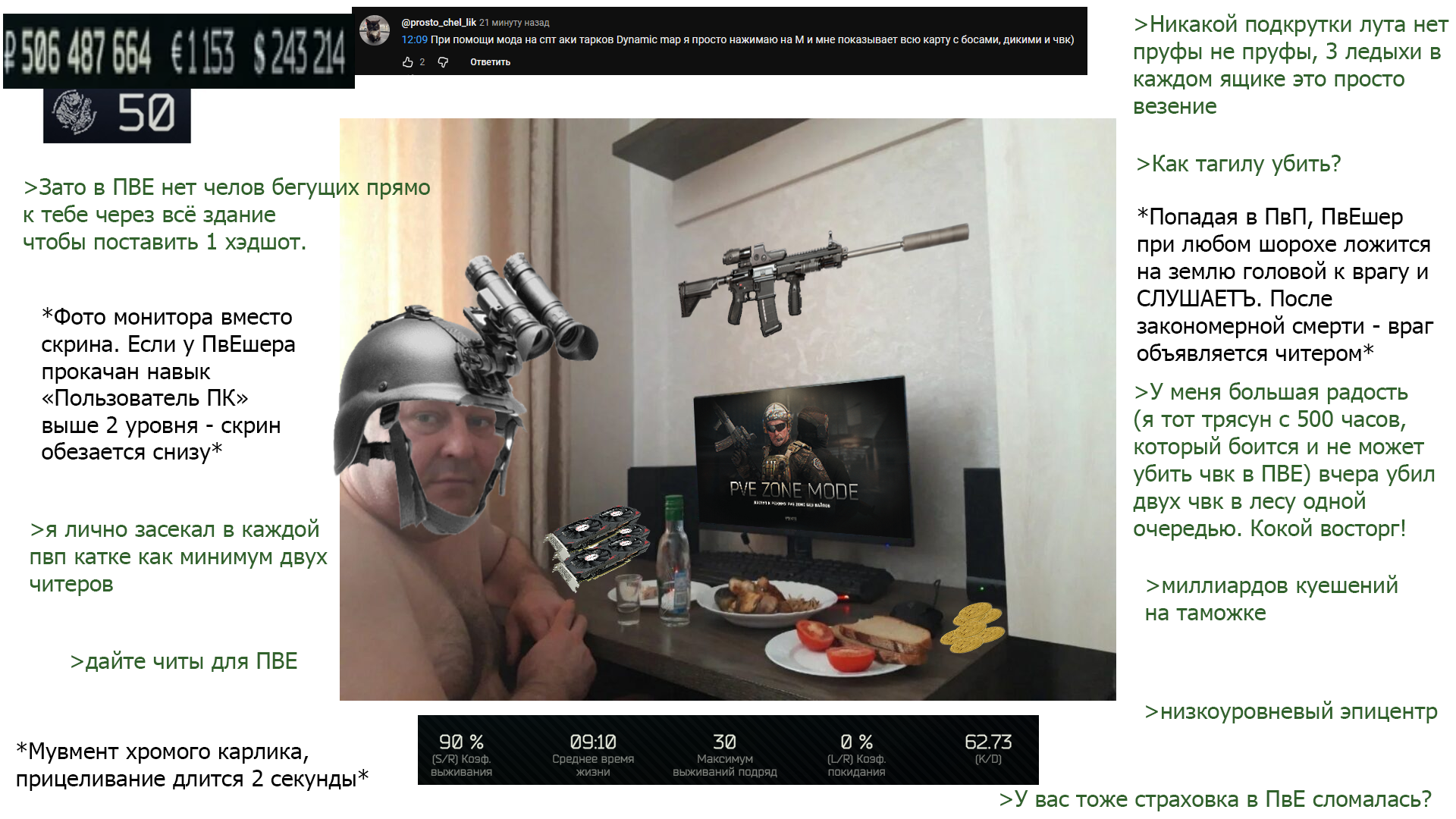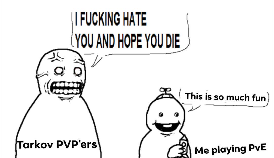 >Все опять скатилось в ебаный метадооч, только раньше он был у чуваков на лабе, а теперь он везде сука. Да так уже несколько лет в таркове, последний год так вообще почти 80% смеретй от типов 3к+ часов и многоачивок, которые просто смотрят в оптику с метаганом. Когда-то там давно был движ сбэу-кустовиков, все поголовно бегали со всякой хуйнёй большими пачками, но этого уже никогда не будет. Либо ты понимаешь во что ты играешь, как изменилась игра и адаптируешься к этим изменениям, либо проще не играть. Нахуя терпеть, если ты не получаешь положительных эмоций.