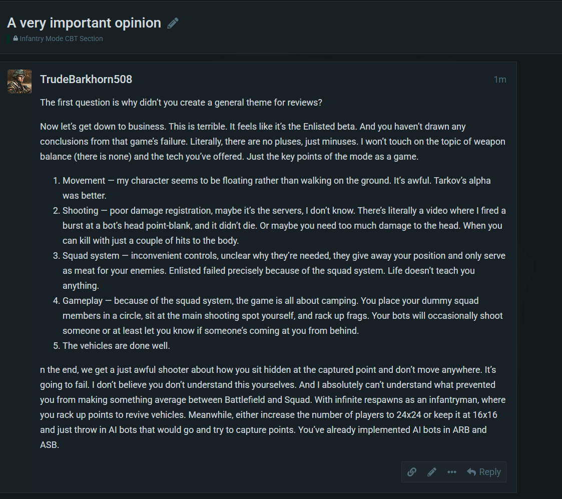 Началось ЗБТ пехоты, кто получил инвайты, 3 дня игры для вас! чудо отдача, баги, иннерция, солдаты неправильно держат оружие, прокачка ОБОЙМ. США стартует с 20 патронами в стоке на М4. Даже бета энлистеда была лучше, такой даунгрейд сделать на основе своей же игры - смогли только улитки.