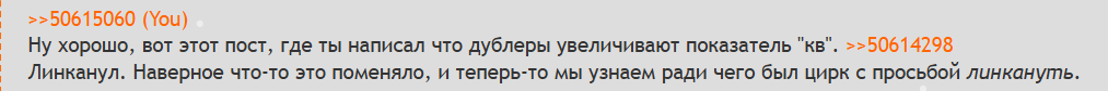 >>50615060 Ну хорошо, вот этот пост, где ты написал что дублеры увеличивают показатель "кв". >>50614298 Линканул. Наверное что-то это поменяло, и теперь-то мы узнаем ради чего был цирк с просьбой линкануть.