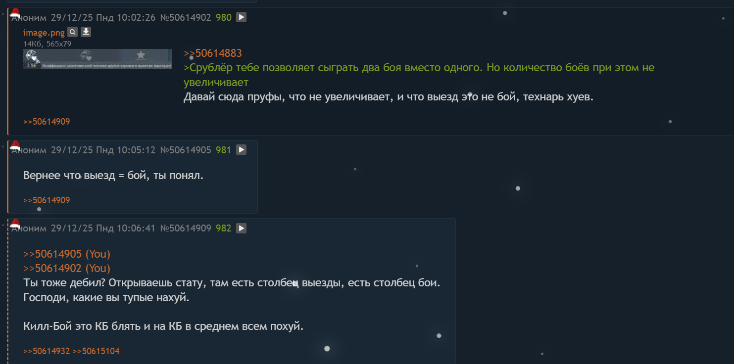 >>50614936 >Перечитай что я писал Ну, читаю. >С учётом срублёров мазутодауны должны делить своё кв пополам Ты написал что дублеры увеличивают показатель "кв". Далее тебя обоссало два человека, указав что под кв всеми включая игру подразумевается "килл - выезд", и показателя "килл - баттл" не существует, с чем ты сам и согласился: >Килл-Бой это КБ блять и на КБ в среднем всем похуй С чем в свою очередь я тоже согласился: >Ну да, всем действительно похуй. Ведь нет такого показателя, который ты сам выдумал. Ведь кв это килл - выезд, который и считает игра. Который руинится дублером точно также как вторым респом другого танка. С чем ты все еще здесь не согласен, или что тебе не понятно? Что ты хочешь доказать? То что ты считаешь себя очень умным но таковым не являешься ты мне уже доказал. А по теме спора осталось что-то?