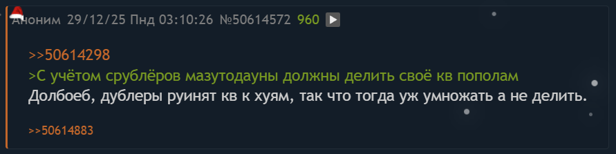 >>50614970 >>Ты написал что дублеры увеличивают показатель "кв". Я его процитировал над данным предложеним, но процитирую еще раз на всякий случай: >С учётом срублёров мазутодауны должны делить своё кв пополам Теперь можешь использовать CTRL+F для поиска своего же поста.