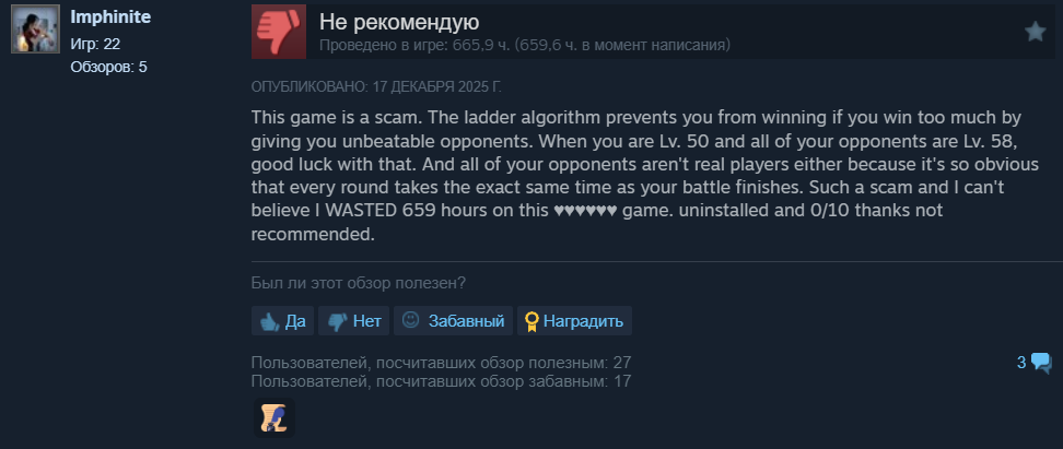 Это пиздец... Антем 9... игора с топовым графоном, музоном - играет 36 человек. Клон Растения против Зомби про сосисочки на гриле... уже 600 человек ебашит. Запрос на рогалик клоны РпЗ походу высок. Ну там революционный геймплей. Ты типа три шампура на гриле двигаешь. Передний шампур у тебя танк, задние стреляют и с каким-то эффектом. Начинки для гриля разные можно нанизать, героев в пуле как в Бротате походу.