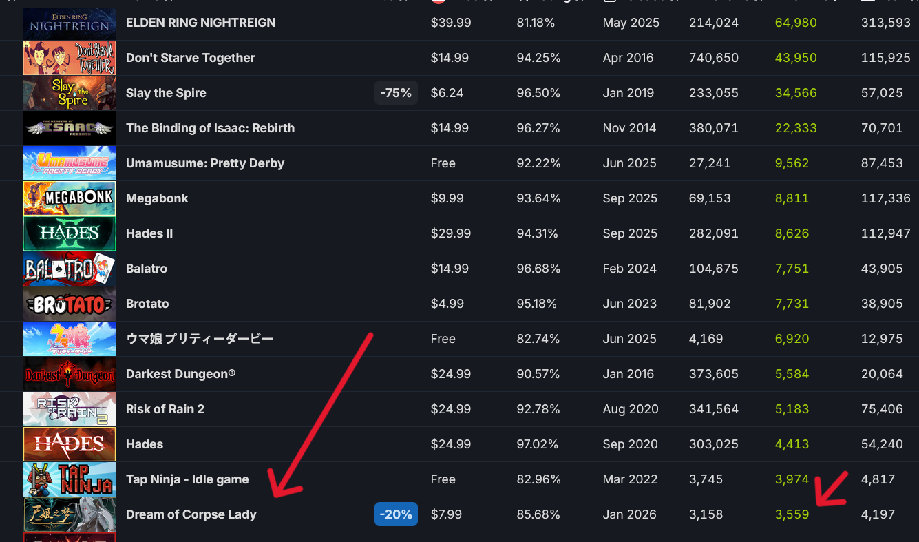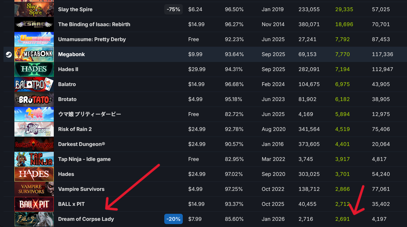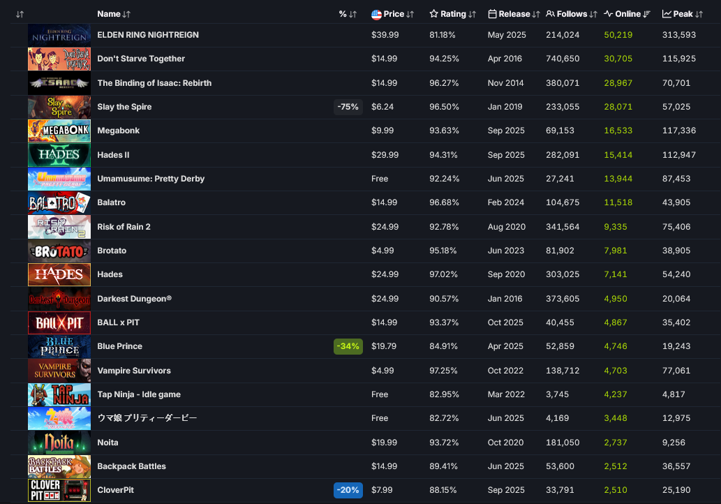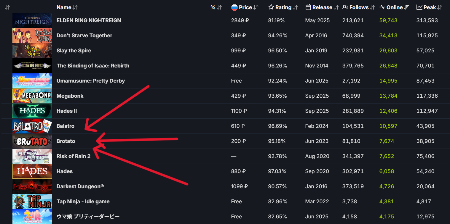>>50704351 180 онлайна это норм. Там есть целые страницы рогаликов вышедших за долгие месяцы, у которых со старта 0 онлайна. Набрать в стиме на рогаликах хоть 100 человек, это уже достижение. Ну и ещё мы узнали, что сисикписик автоматически добавляет твоей игоре 700 игроков. В турнбаунде этом 3 героя и всего 150 предметов. Я хуй знает зачем они игры без контента выпускают.