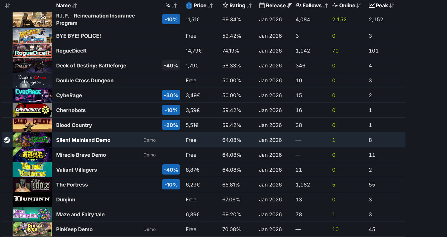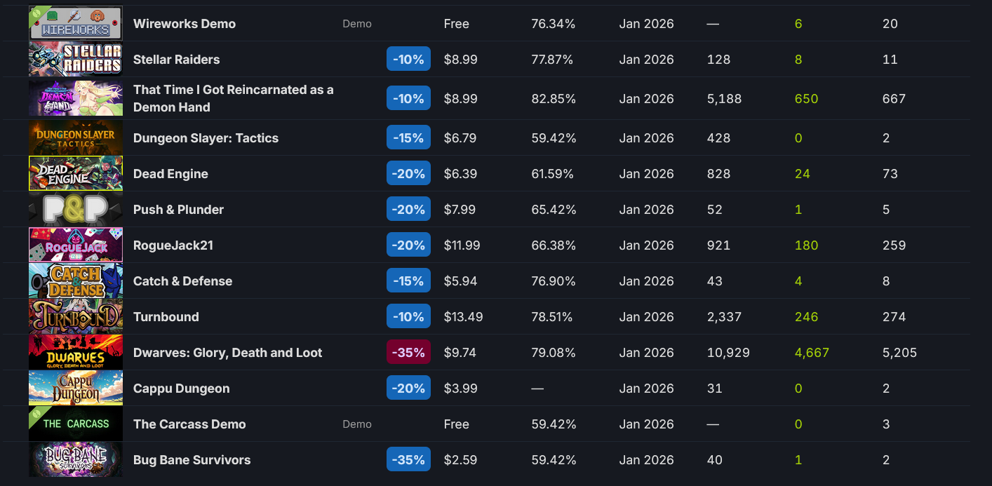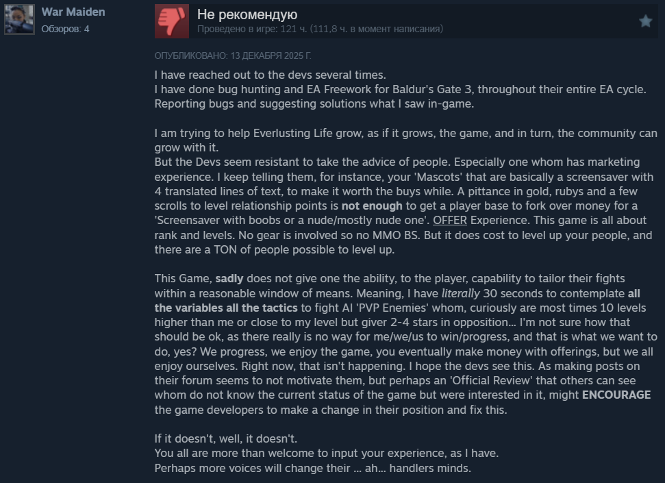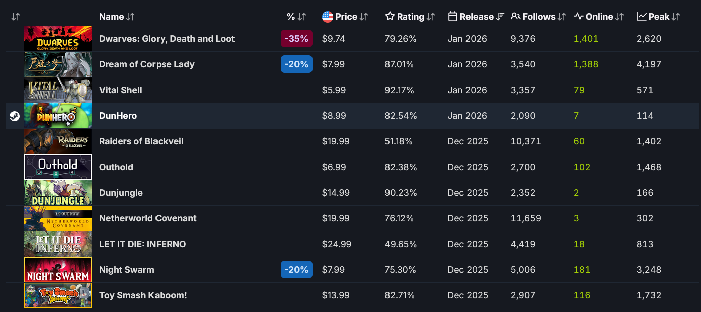 >>50704351 180 онлайна это норм. Там есть целые страницы рогаликов вышедших за долгие месяцы, у которых со старта 0 онлайна. Набрать в стиме на рогаликах хоть 100 человек, это уже достижение. Ну и ещё мы узнали, что сисикписик автоматически добавляет твоей игоре 700 игроков. В турнбаунде этом 3 героя и всего 150 предметов. Я хуй знает зачем они игры без контента выпускают.