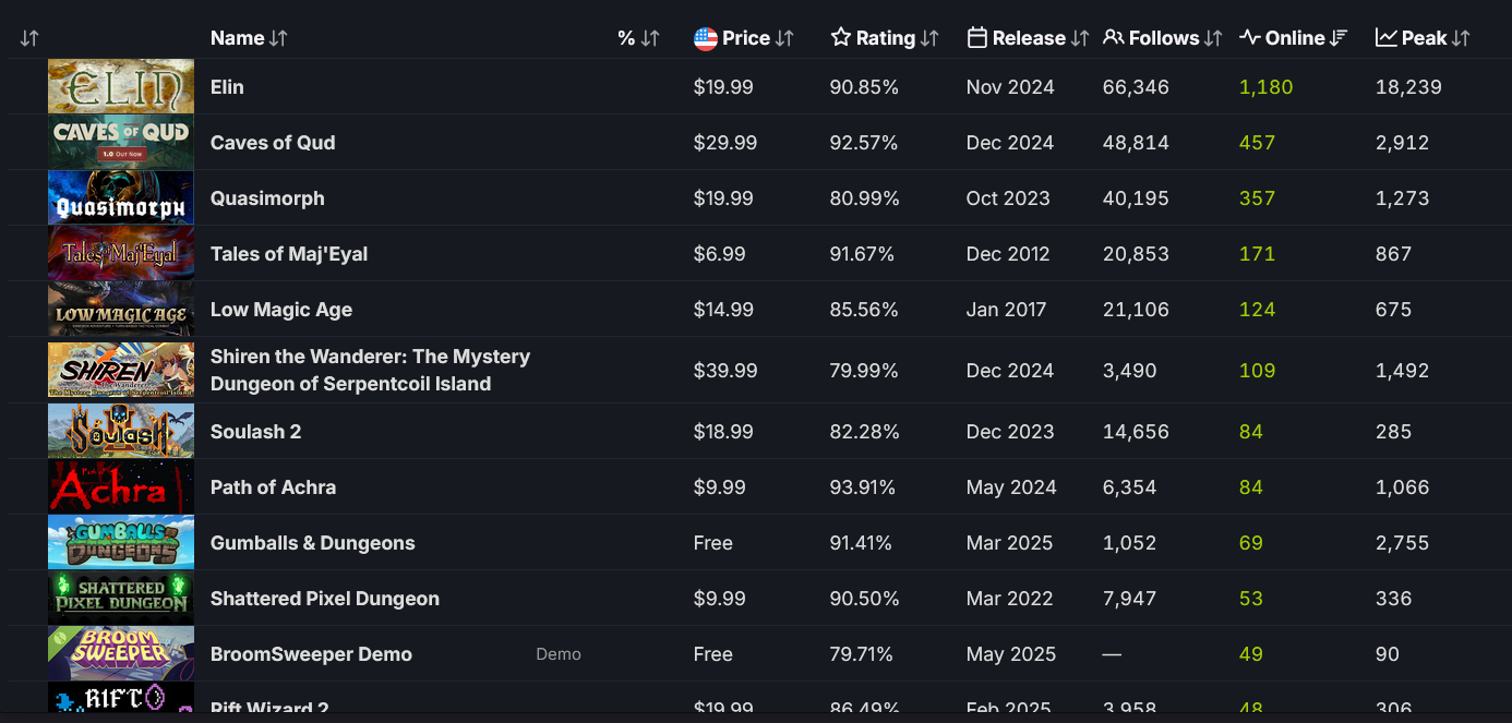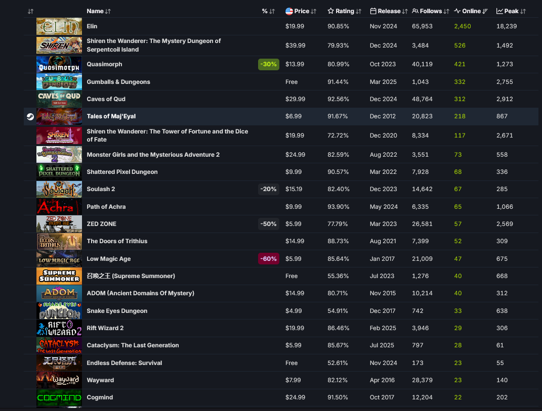 Так, что у нас по новым рогаликам. Джек21 оказался не совсем гавном, в него играют!1 Почти 300 человек!1 И это в рамках рогаликов дохуя. Там целые страницы с сотнями новых рогаликов в которые не играет никто. Как мы видим ещё появился некий хентай рогалик - That Time I Got Reincarnated as a Demon Hand. Сисикписик приманил аж 700 игроков. Дворфики блять... в них уже 5 000 играют. Я на рутрекере скачал, меня заебало за пол часа, я хуй знает, что они там делают. Тасовать целую пачку дворфов жуткий геморрой.