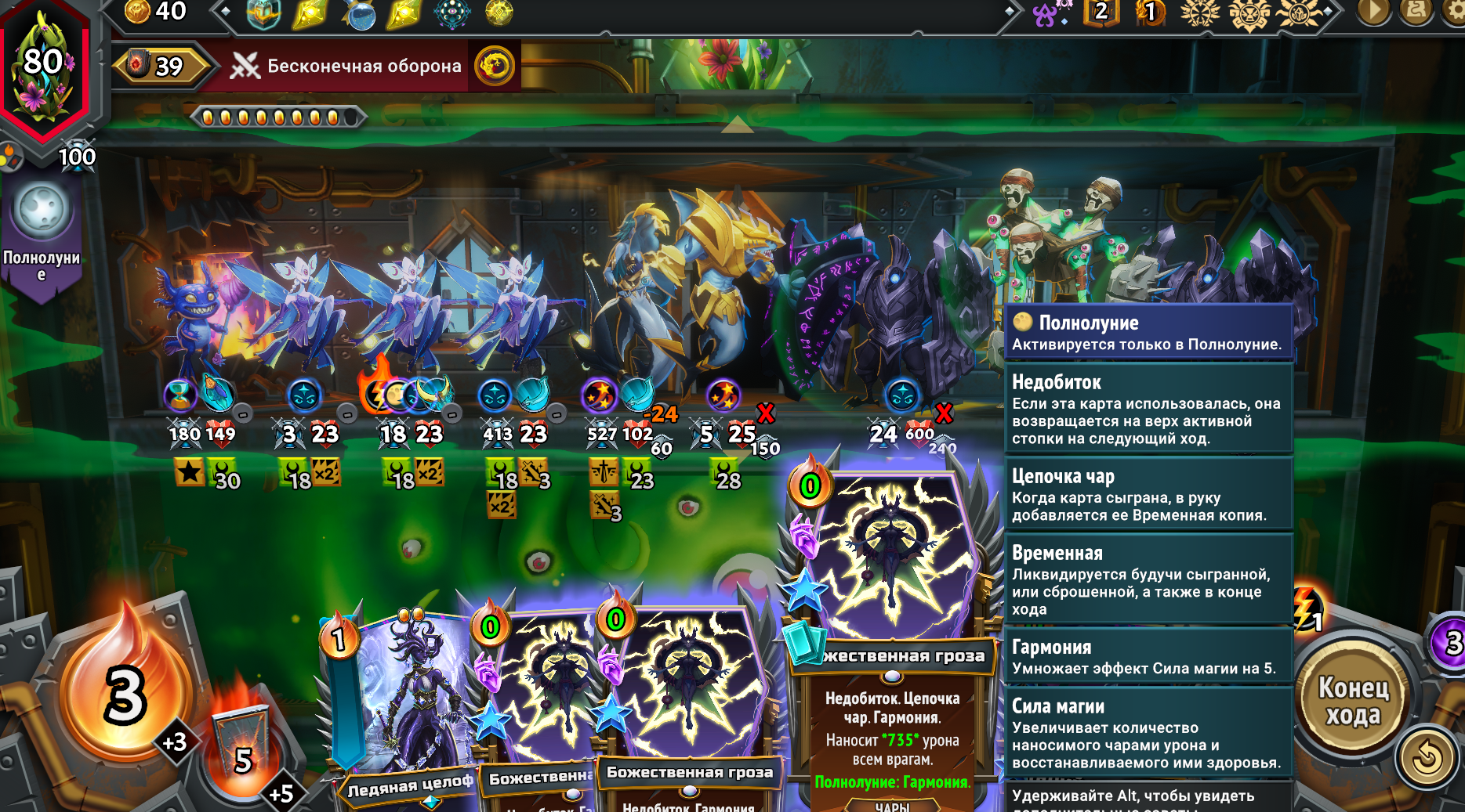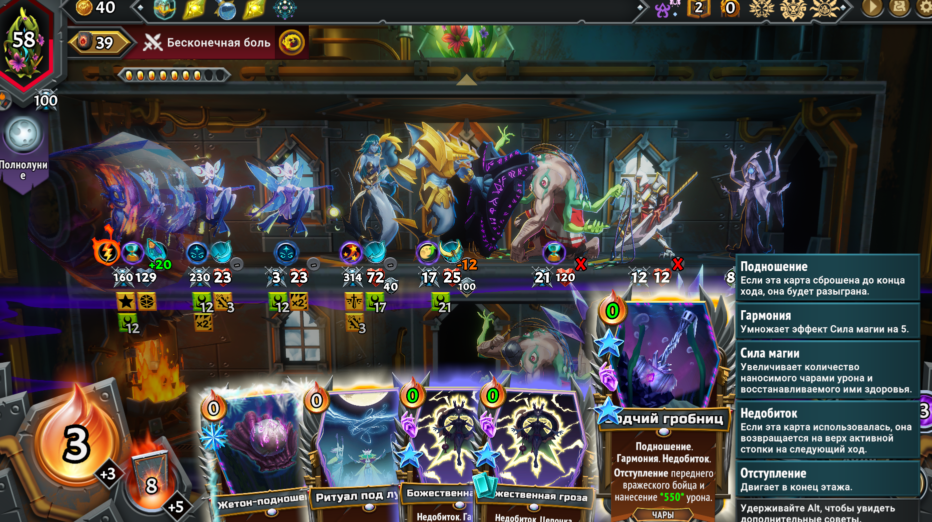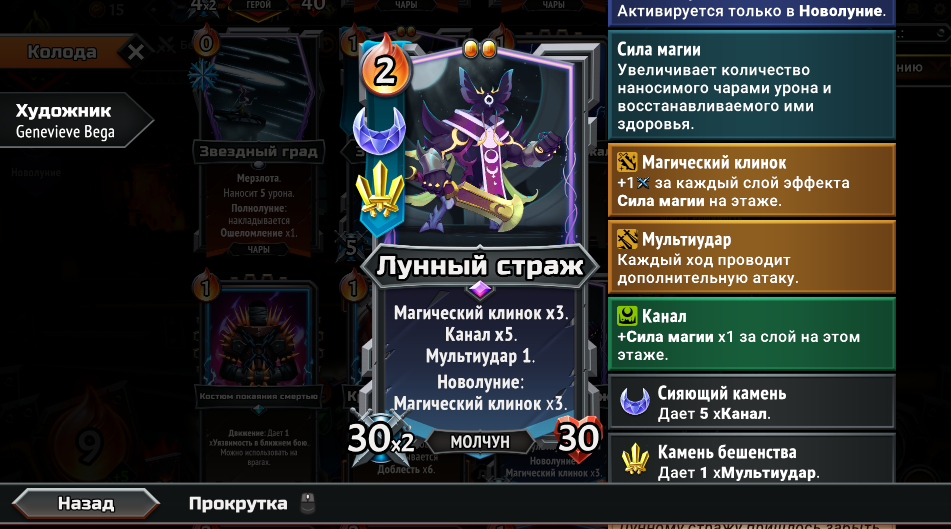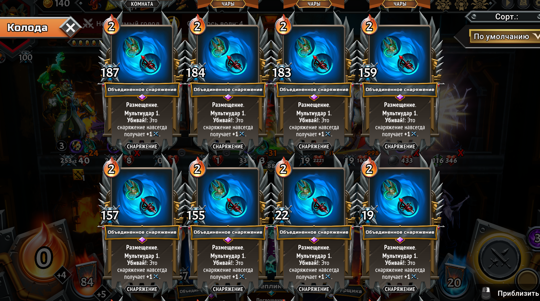 Собрал магическую имбу, взяв магические Кланы из первого и второго монстер трайна вместе. Ну чё получилось. Бесплатная в использовании из-за перка Героя, массовая молния сразу на всех врагов, которая после использования всегда возвращается тебе в руку на следующий ход и при активации создаёт свой дубликат. Так же получился сингтаргет молот. Оба заклятия на 500 дамага. Появилась новая проблема. Из-за того, что вся рука забита этими дамаг картами, плохо ролятся другие нужные карты. Например феечки, которые увеличивают магический дамаг в этой комнате и карты меняющие лунные циклы. Нужно наверное после второго босса брать увеличения размера руки, а не вместимость этажа. Но если не увеличить вместимость как феечек всовывать? Замкнутый круг. Ну щя посмотрим... на каком уровне отсосу.