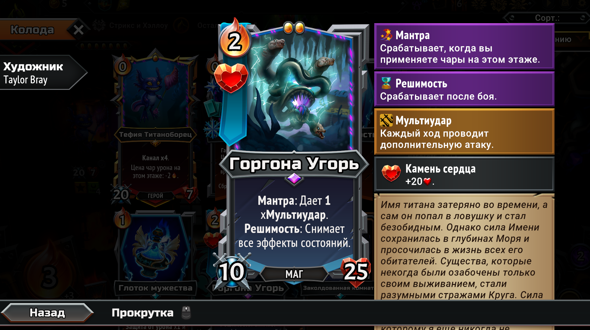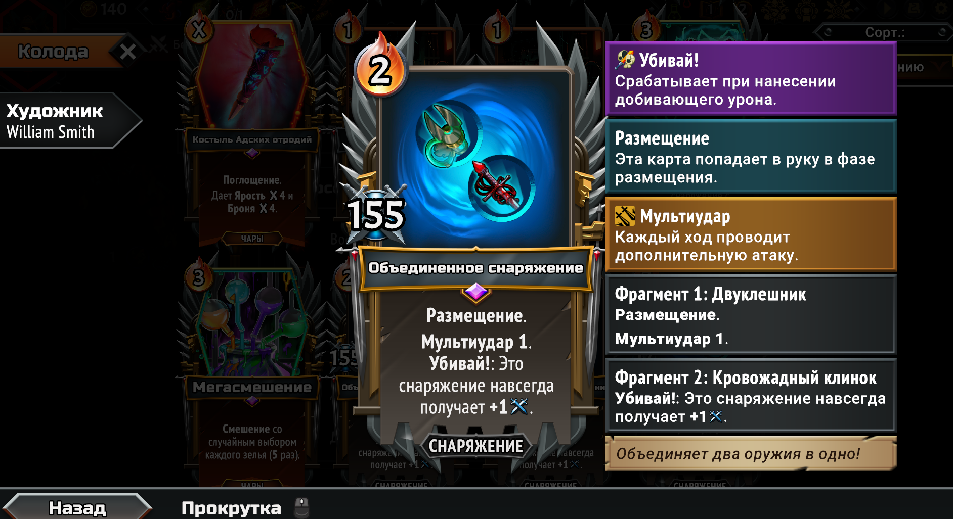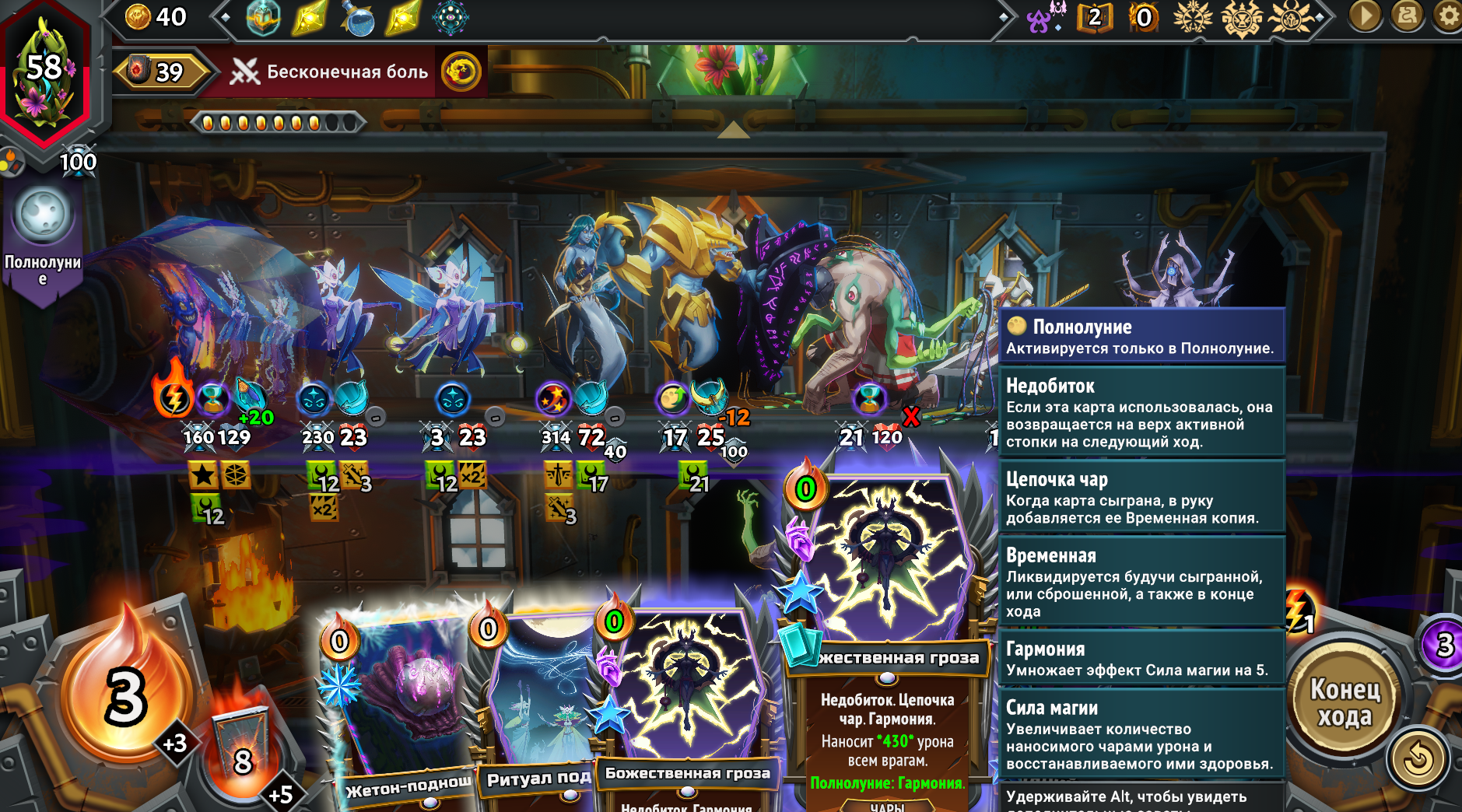 Собрал магическую имбу, взяв магические Кланы из первого и второго монстер трайна вместе. Ну чё получилось. Бесплатная в использовании из-за перка Героя, массовая молния сразу на всех врагов, которая после использования всегда возвращается тебе в руку на следующий ход и при активации создаёт свой дубликат. Так же получился сингтаргет молот. Оба заклятия на 500 дамага. Появилась новая проблема. Из-за того, что вся рука забита этими дамаг картами, плохо ролятся другие нужные карты. Например феечки, которые увеличивают магический дамаг в этой комнате и карты меняющие лунные циклы. Нужно наверное после второго босса брать увеличения размера руки, а не вместимость этажа. Но если не увеличить вместимость как феечек всовывать? Замкнутый круг. Ну щя посмотрим... на каком уровне отсосу.