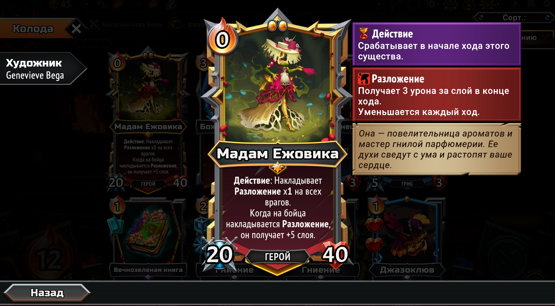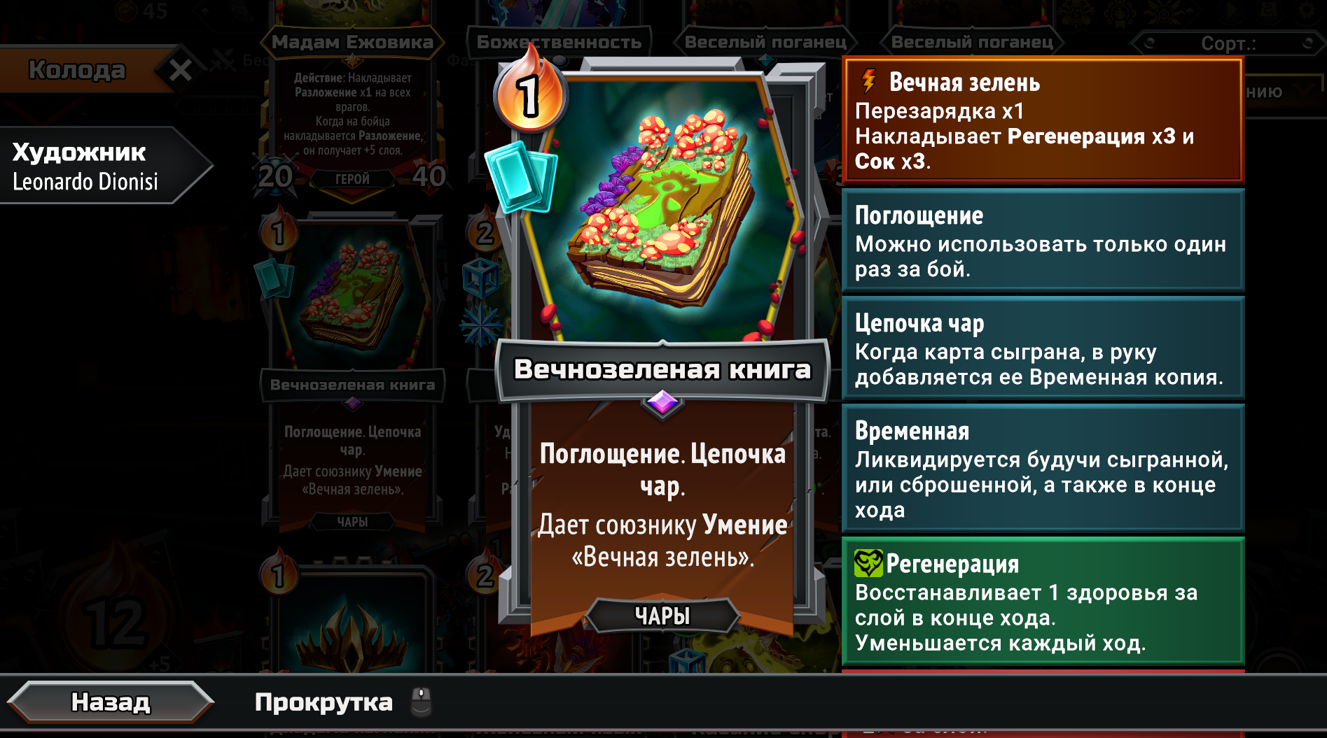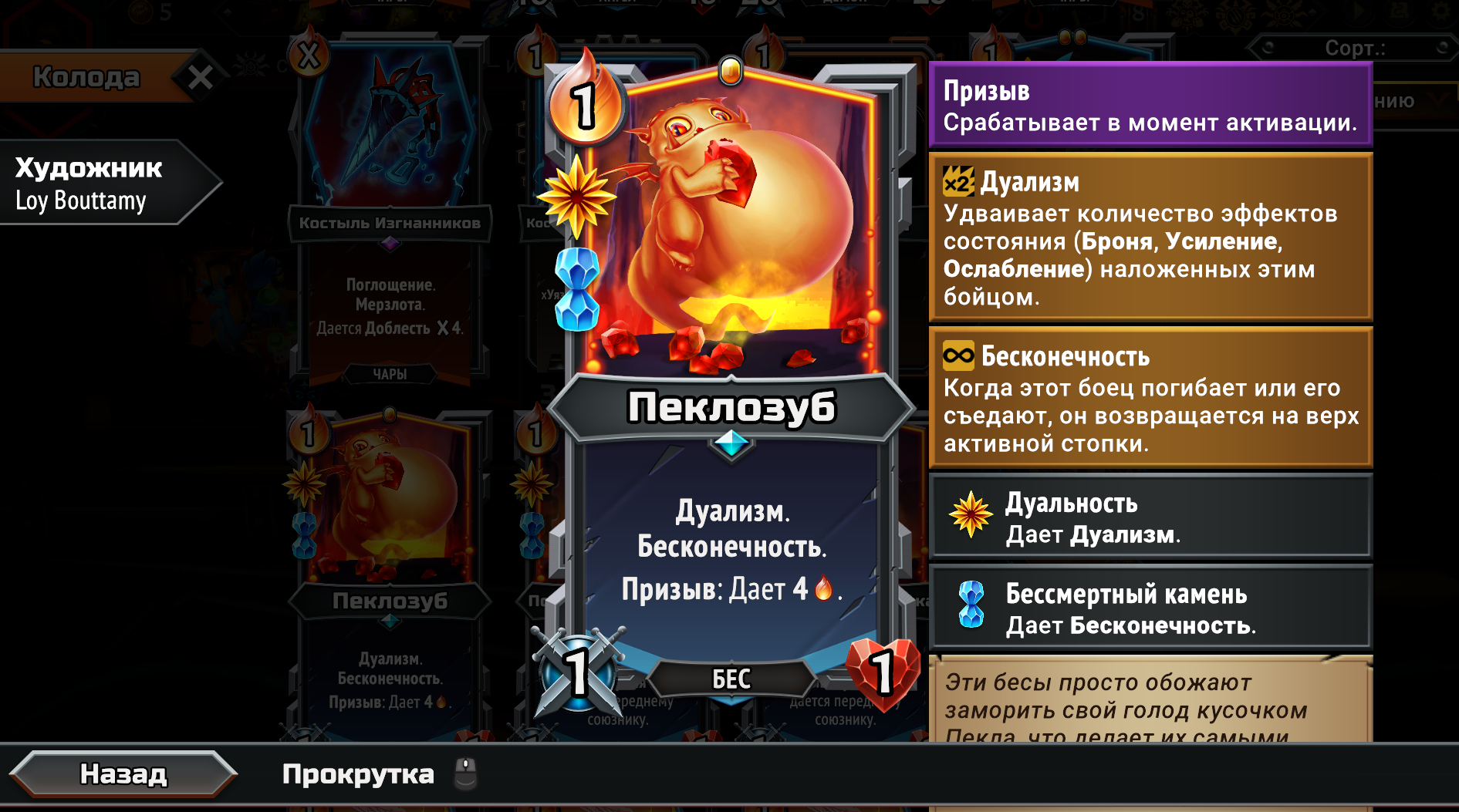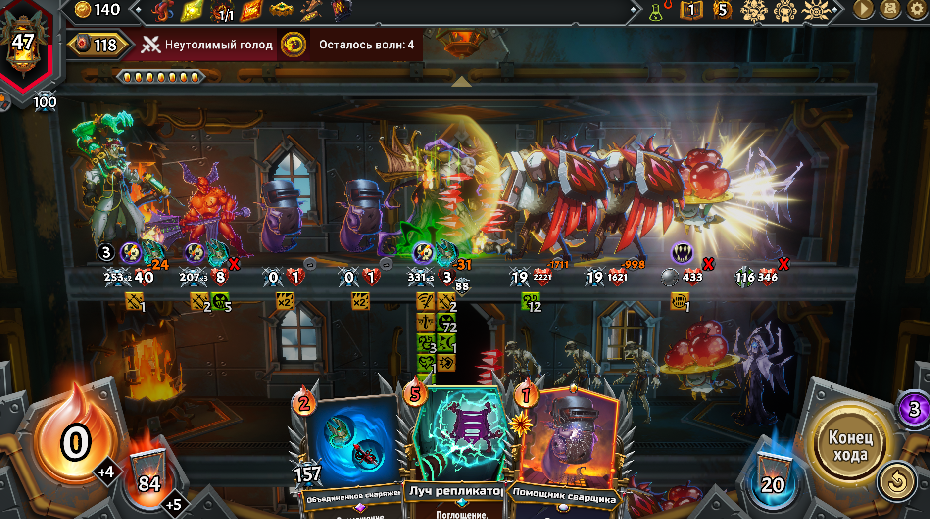 Собрал магическую имбу, взяв магические Кланы из первого и второго монстер трайна вместе. Ну чё получилось. Бесплатная в использовании из-за перка Героя, массовая молния сразу на всех врагов, которая после использования всегда возвращается тебе в руку на следующий ход и при активации создаёт свой дубликат. Так же получился сингтаргет молот. Оба заклятия на 500 дамага. Появилась новая проблема. Из-за того, что вся рука забита этими дамаг картами, плохо ролятся другие нужные карты. Например феечки, которые увеличивают магический дамаг в этой комнате и карты меняющие лунные циклы. Нужно наверное после второго босса брать увеличения размера руки, а не вместимость этажа. Но если не увеличить вместимость как феечек всовывать? Замкнутый круг. Ну щя посмотрим... на каком уровне отсосу.