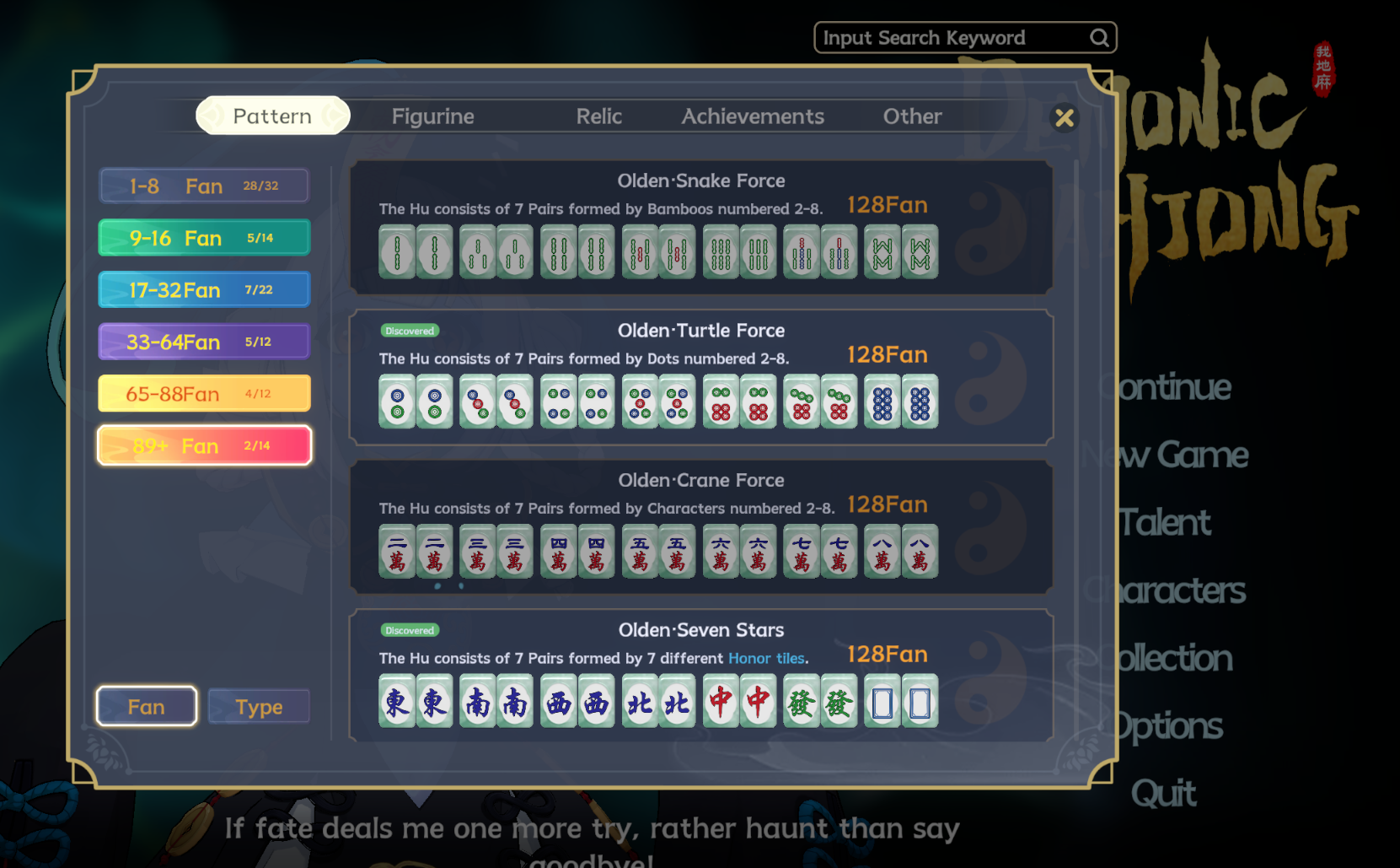Комбаха на 52 000 000, было бы ещё больше, но у меня ходы закончились, а в катке не нападало реликвий увеличивающих количество рук, которые можно собрать. Комбинаций из четырёх нахуй!1 Закрытых Канов Благородных Тайлов. Три из них Драконы. В маджонге с традиционными правилами эту комбинацию практически невозможно собрать. Открылся перс, который выглядит как лютый геморрой. За неё нужно собирать последовательности 1 2 3 - 4 5 6 - 7 8 9 Причём обычный комбы дешёвые, чтобы разваливать за неё, нужно собирать последовательности одной масти какой-то. Но зато она генерирует при этом деньги для магаза.