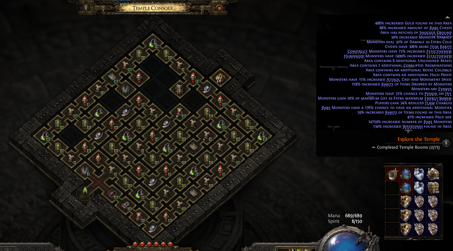 633 ну я сбегал сейчас храм мобов миллион херальды все лопают по 50+ хх стаков выпала 12д чистыми шапка т0 за 19 д тушка хайри за 6 по мелочи чуда типа т3 экз хаосик рарити в храме 688% открыл еще раз схему вижу что можно передуть значение х2-2.5 думаю если не понерфят будут бегать до победного пока миррор не упадет с таким надутым храмом где и мобов много и лута дохуя у меня появилось ощущение словно я зашел в пое1 но с хорошей графикой очень жаль тех кто давится виженом на маппинге и нюхает крошки которые в храме из лутфильтра ваще убраны