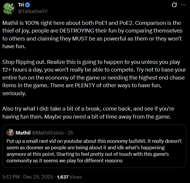 2) We all watch streamers having fun, looting a sht ton of divines per hour. Stable income. We all know, it CAN be extreemly profitable. And it is - for those, who play 10+ hours a day. The dopamine flow is real - for those, who invest tons of hours into it. Into map running and building their temple.