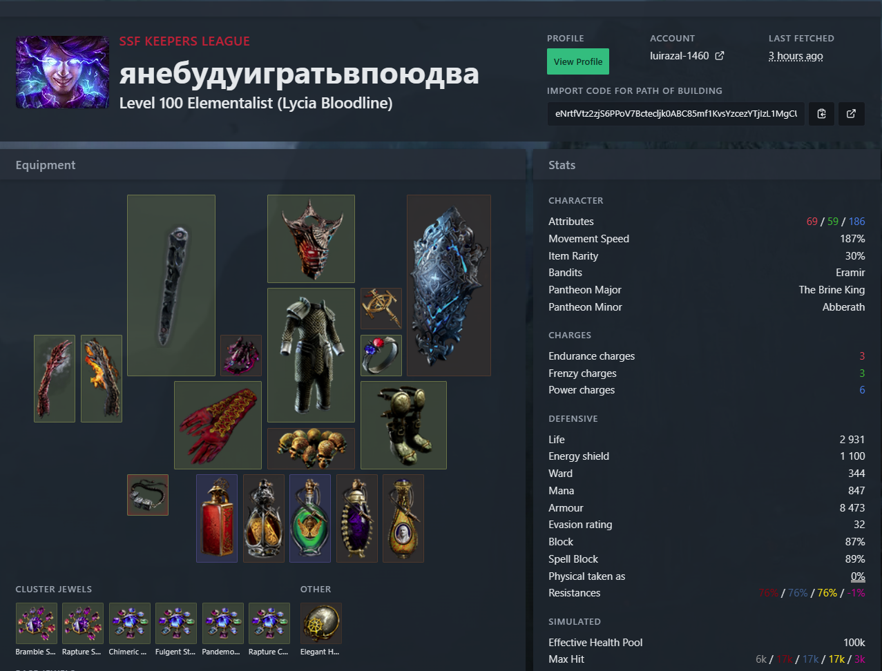 с прискорбием сообщаю, что Харчок☃️ снеговичок пал на 83 левеле на жёлтой карте от рук Китавы(лол кек), пока я отвлёкся на видосик на втором мониторе в связи с позорной смертью он был удалён так как не смог бы жить на сафте клиент пое был тоже удалён до следующей лиги цели добить челленджи(взять 90 и пройти 4 лабу) не были достигнуты чувство победы не достигнуто попробуем в следующий раз