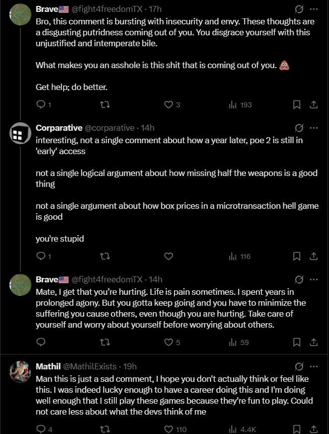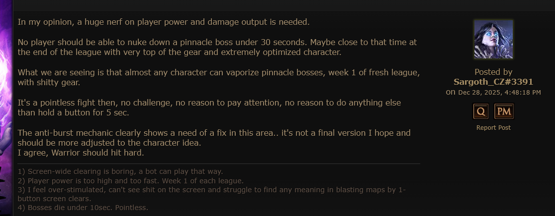 Со старта игры играл за война. Я плакал с того как фармлю и как люди бегали все шотали со скоростью х4 от моей. Я просто ливал с игры из за дизморали что какой то неполноценный. В эту лигу не заходил но услышал что там пати контент имеет кучу преимуществ чем одиночный игрок. Для меня это сразу ред флаг. Это выглядит как мы идем на вечеринку а ты клоун сиди дома мы тебе потом все расскажем как там было. Если пати контент останется таким же, я в игру не когда не зайду. Буду так же сидеть чилить в Д4 где я обосрался с билдом взял пересел на имбовый и весь мой прогресс перенеся на него только надо 1-60 качнуть за 1 ч а весь недельный парагон идет с предыдущего чара. ПоЕ 2 ты ошибся можешь просто ливать с игры