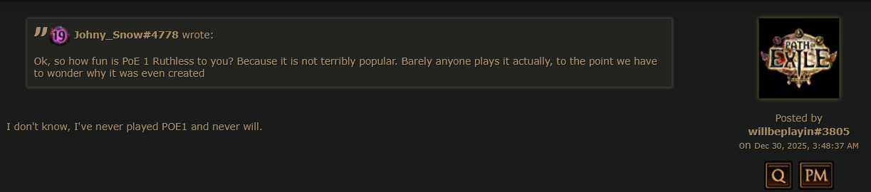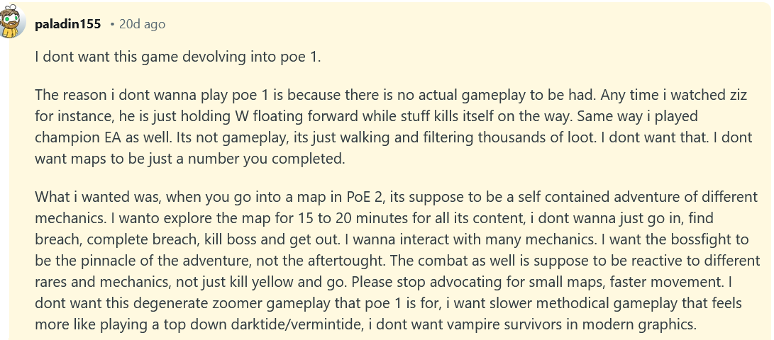 ну вот смотри в пое1 все кал и там нет механик которые можно фармить стабильно и бесплатно в плюс 5 диванов а в пое2 есть потому что ее разработчики любят а пое1 нет