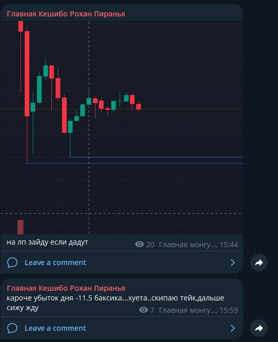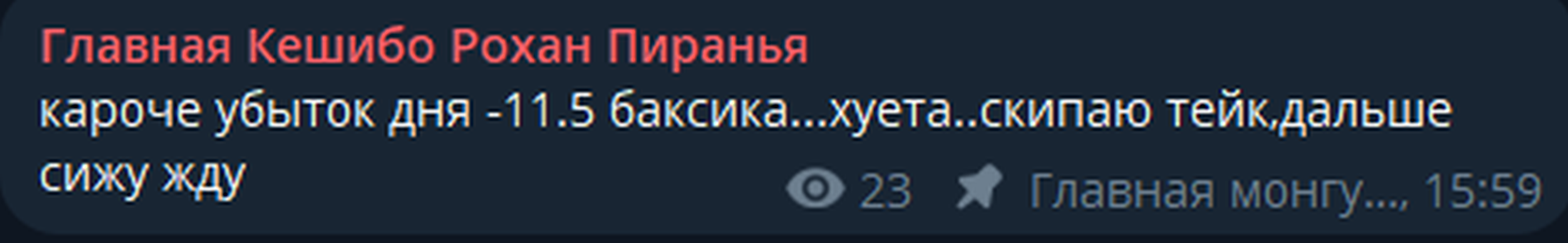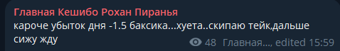 нее ты не понял сначала он потерял > в маменте было -45 потом отбил до > 2 бакса отбить до бу дня и уже под конец > убыток дня -11.5 баксика...хуета..скипаю тейк