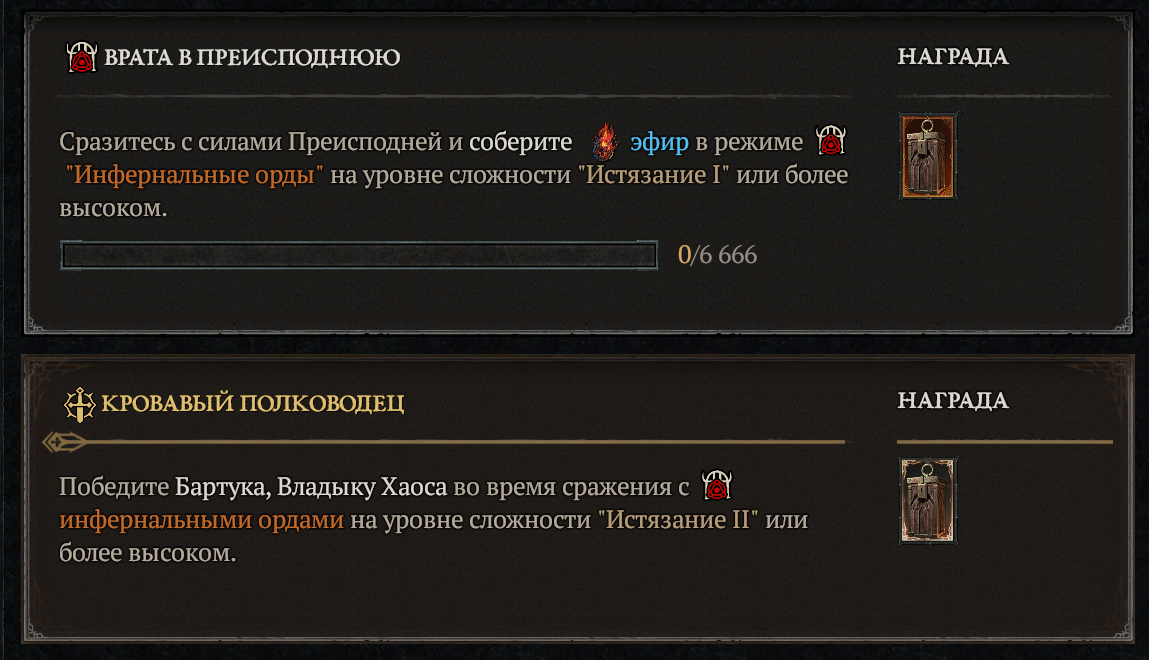 >>50632444 никто не ответил, отвечаю сам себе. надо нафармить 5 частей Андариэль, Белиала или Дюриэля. Падают они соответственно с этих боссов, но не всегда. По ощущениям, проще нафармить Андариэль - в Курасте с Малым подношением Андариэль, и Дюриэля во время адского натиска. Но надо самому нафармить адские сердца и когда нафармишь 3 адских сердца то вызываешь Дюриэля. Часть Дюриеля падает не всегда, опять таки. Когда нафармил 5 частей - идешь убивать Азмодана которого можно вызвать - и открываешь соответствующий сундук. Из него выпадет 1 (!) Язык Азмодана. Все действие, соответственно, надо повторить еще 4 раза. После чего надеяться что в Мировых боссах нароллится Азмодан. А это раз в полтора часа. А теперь вопрос к тем, кто играет регулярно сезоны. Я сезон в Д4 играю первый раз. Это всегда так будет? Если и предыдущие сезоны были с такими же заданиями, то в последующие я играть уже не хочу. Разработчики хотят чтобы я тратил огромное количество времени на непонятный фарм. Да, в Д2 тоже был фарм, но он был понятный и простой. А тут буквально - фарми одно, чтобы нафармить другое. И так часами. Может кому-то нравится, но вот мне не особо понравилось. На любителя, скажем так. Теперь вот фармлю 6666 этого... как его... ну вы поняли. В адском компасе. уже нафармлено 4500, но голова гудит уже от этих звуков адских. Я не могу. Зачем я в это играю? Зачем вы в это играете? От этого реально кто-то получает удовольствие?
