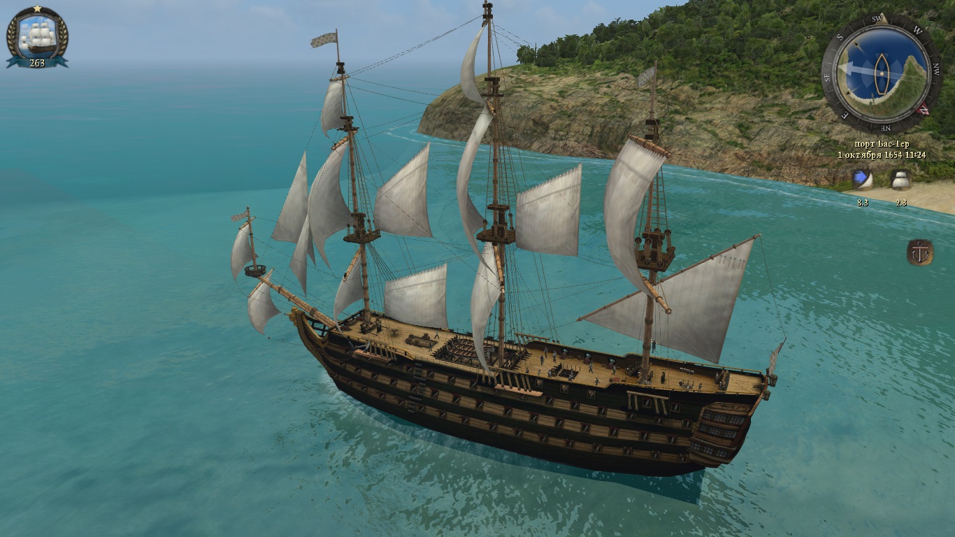 Главное меню сразу настраивает на нужный лад и готовит к калтенту: 1 Суперразмытые текстуры земли 2 Спрайтовый куст справа 3. Огромные окошки "Подсказки" с выходящим за рамки шрифтом 4. Корабль с порванными ХхХ_МоДнЮчИмИ_ПаРуСаМи_хХх 6. Бочка (пока бесплатная)