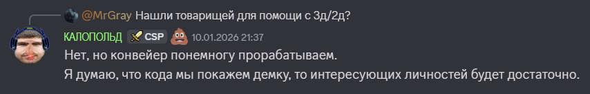 >>50662906 Не просто бомбит, а жёстко коупит. Сначала пытался выехать на "в кл круто, но у нас бесплатно, а с подпиской на бусти вообще в плюс выйдете", потом жопу ещё немного подпалило и переобулся "платно всё-таки будет, но когда сделаем круче, чем в кл". В итоге затеял переделать все ассеты в игре с 0 усилиями рандомов из интернета, лишь бы выйти в стимчик, не целуя жорубе залупу с извинениями за слив. На его клич о помощи откликнулось ровно 0 мамонтов, о чём сам недавно писал в загончике.