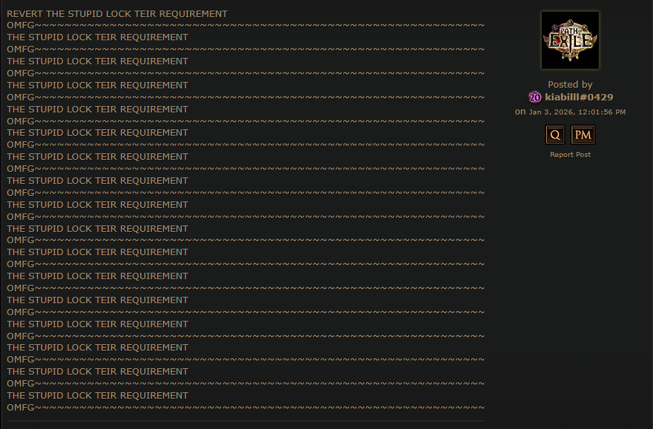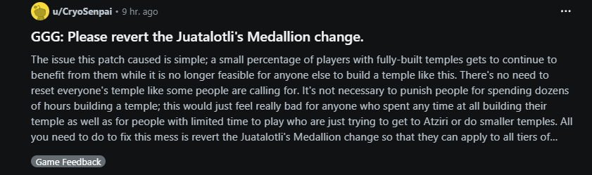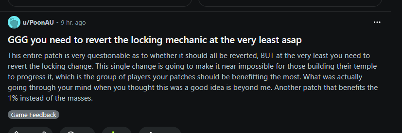Как нам наказать GGG? [Удалено службой поддержки] Это так удручающе, почему бы вам не делать то, что вы должны делать, вместо того, чтобы заниматься своим эгоизмом? ДАЙТЕ НАМ СТРОИТЬ ХРАМЫ. Вы не можете просто позволить нескольким людям построить огромные храмы и украсть доступ к ним для остальной части игроков. Что с вами не так?