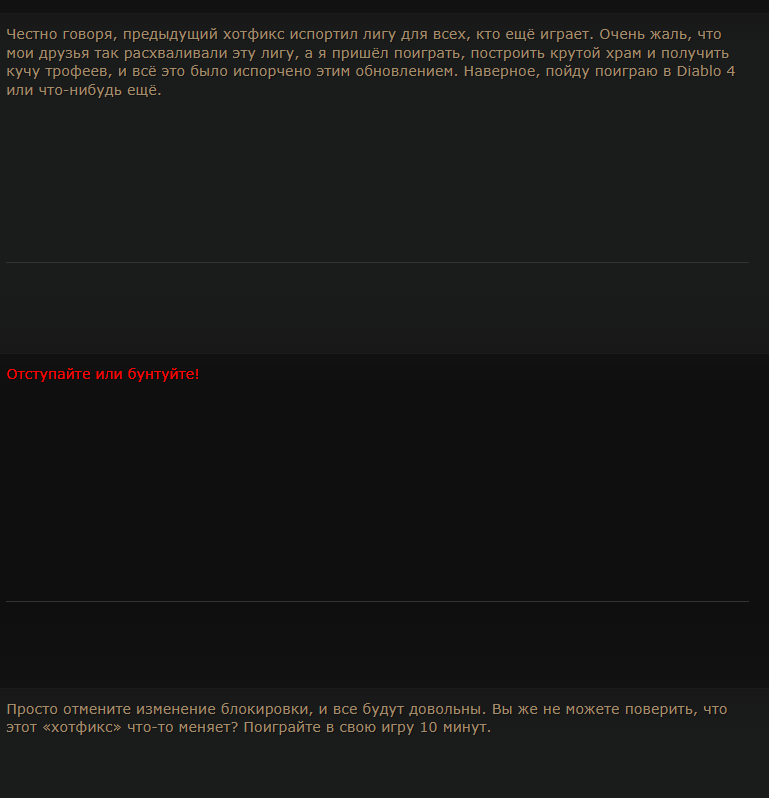 хули тут залетная дура развела паникерство ору нах 1% рмт нищеты бахнуло с нерфа очевидного брокен контента Я бы вообще банил аккаунты всем недовольным отписавшим в теме хотфикса.