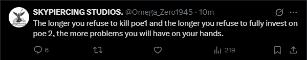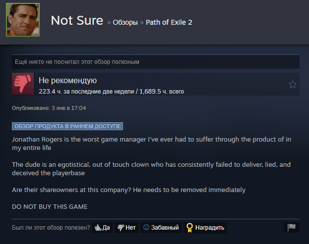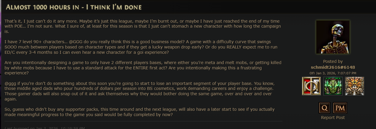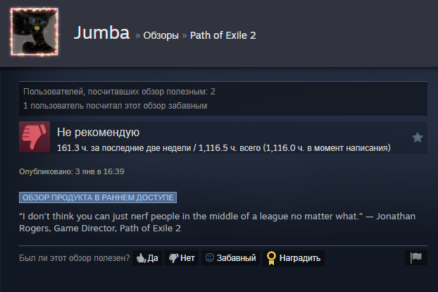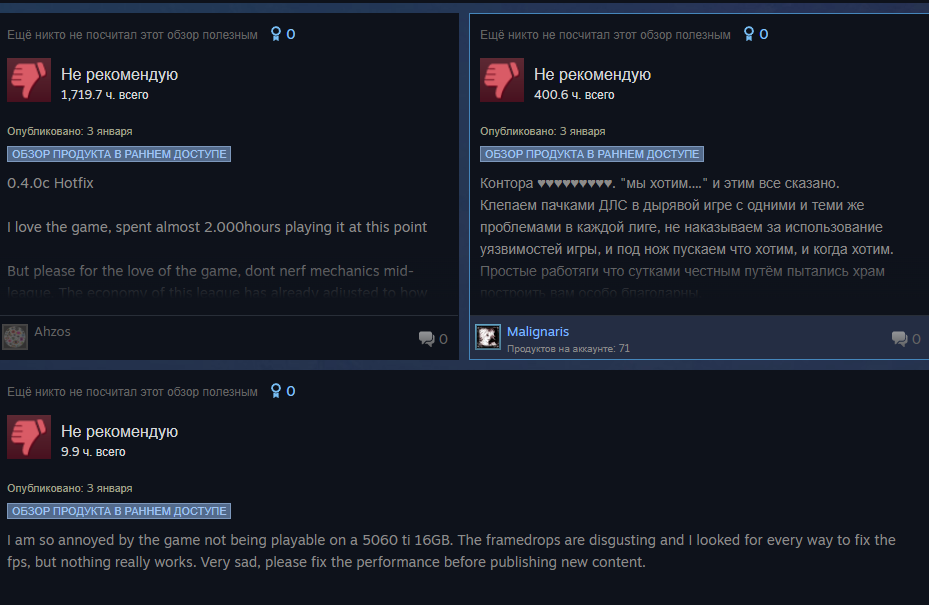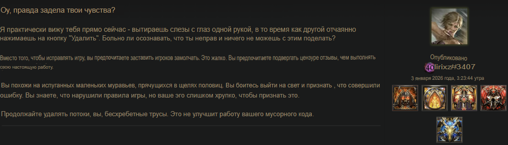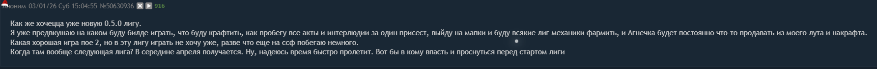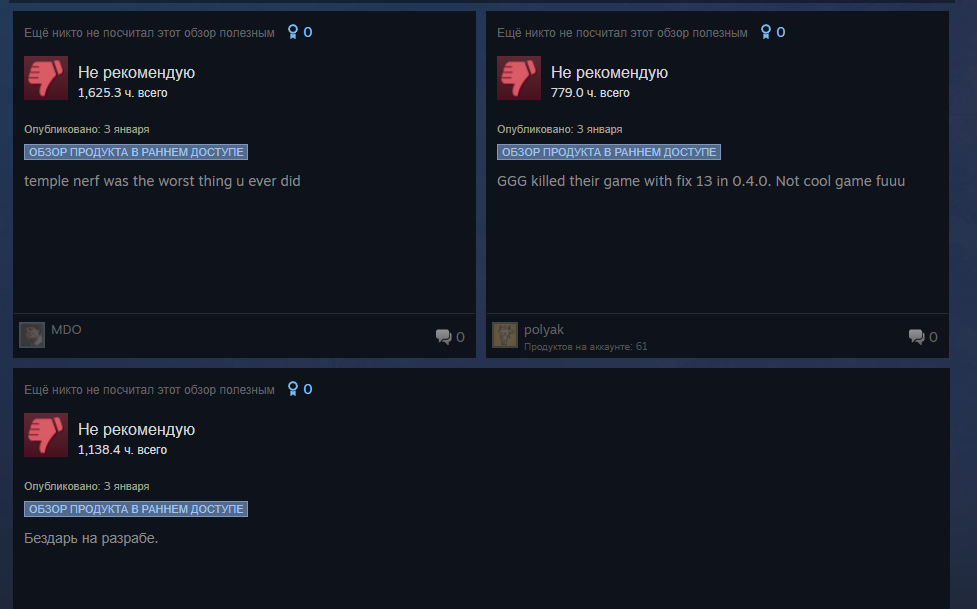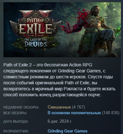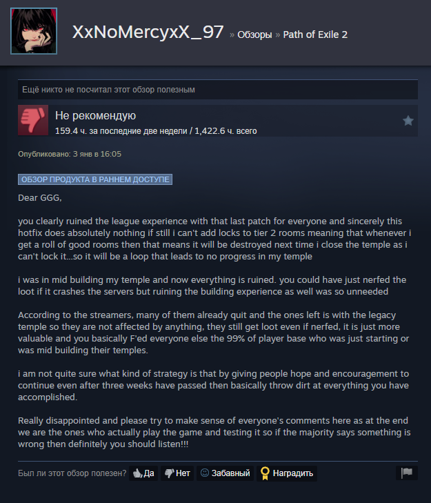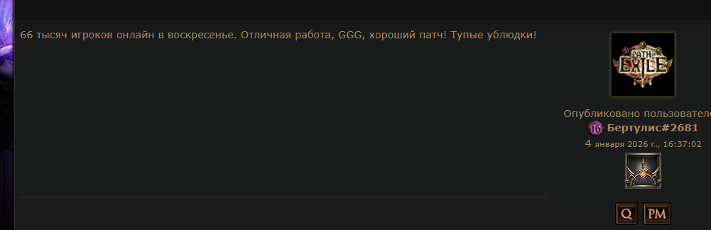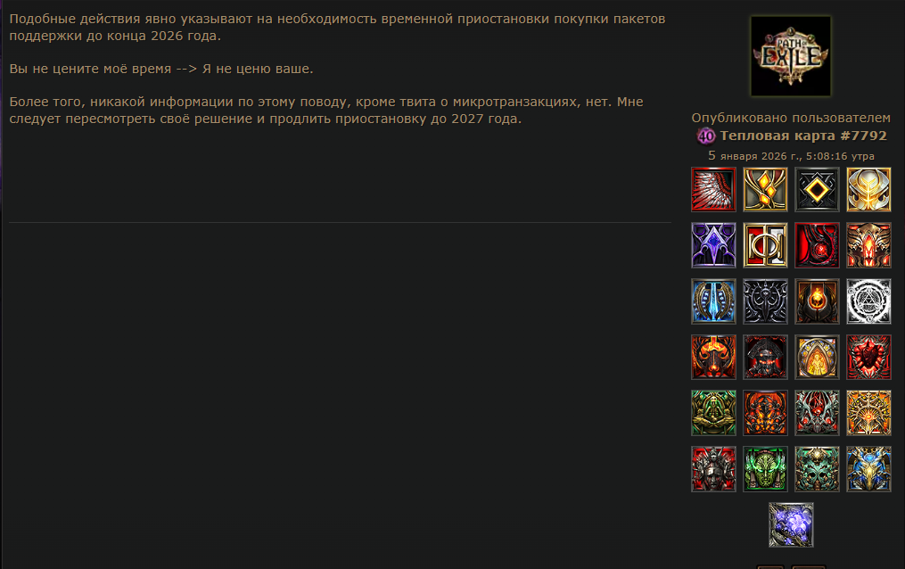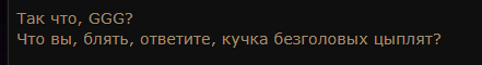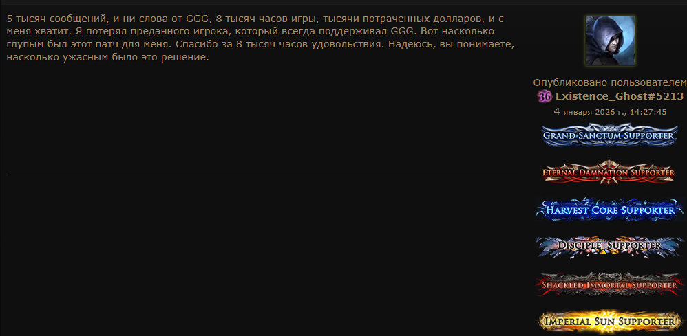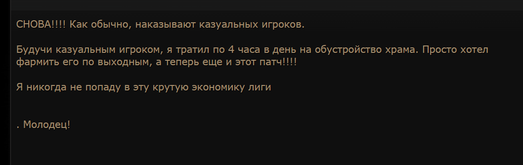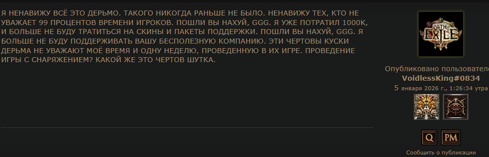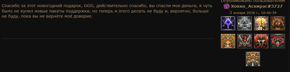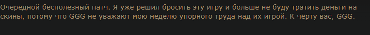 Уважаемая GGG, я удалил игру. Больше нет смысла в неё играть. В этом сезоне я создал два билда, но ваши неправильные решения и разрушение экономики на раннем этапе сделали игру для меня невыносимой. Честно говоря, если бы это было возможно, я бы потребовал возврата всех потраченных денег и больше никогда не хотел бы играть в эту игру. Пожалуйста, поймите: игроки хотят играть в вашу игру и получать от неё удовольствие. Нам не нравится играть так, как вы хотите. Почему вы до сих пор этого не понимаете?