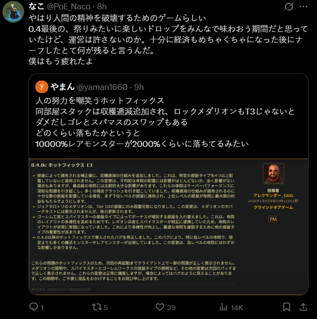 нако @PoE_Naco - 8ч ... Кажется, это игра для разрушения человеческого духа. Я думал, что 0.4 — это последний период, когда мы все могли наслаждаться веселым дропом, как на фестивале, но администрация не позволяет этого. Что останется, если все понерфить после того, как экономика уже достаточно разрушена? Я уже устал. яман @yaman1660 - 9ч Хотфикс, высмеивающий человеческие усилия: в комнаты добавлена убывающая доходность, медальоны рока работают только с Т3, а также поменяли местами големов и мастеров шпионажа. Насколько сильно упал дроп? Кажется, редкие монстры упали с 10000% до примерно 2000%.